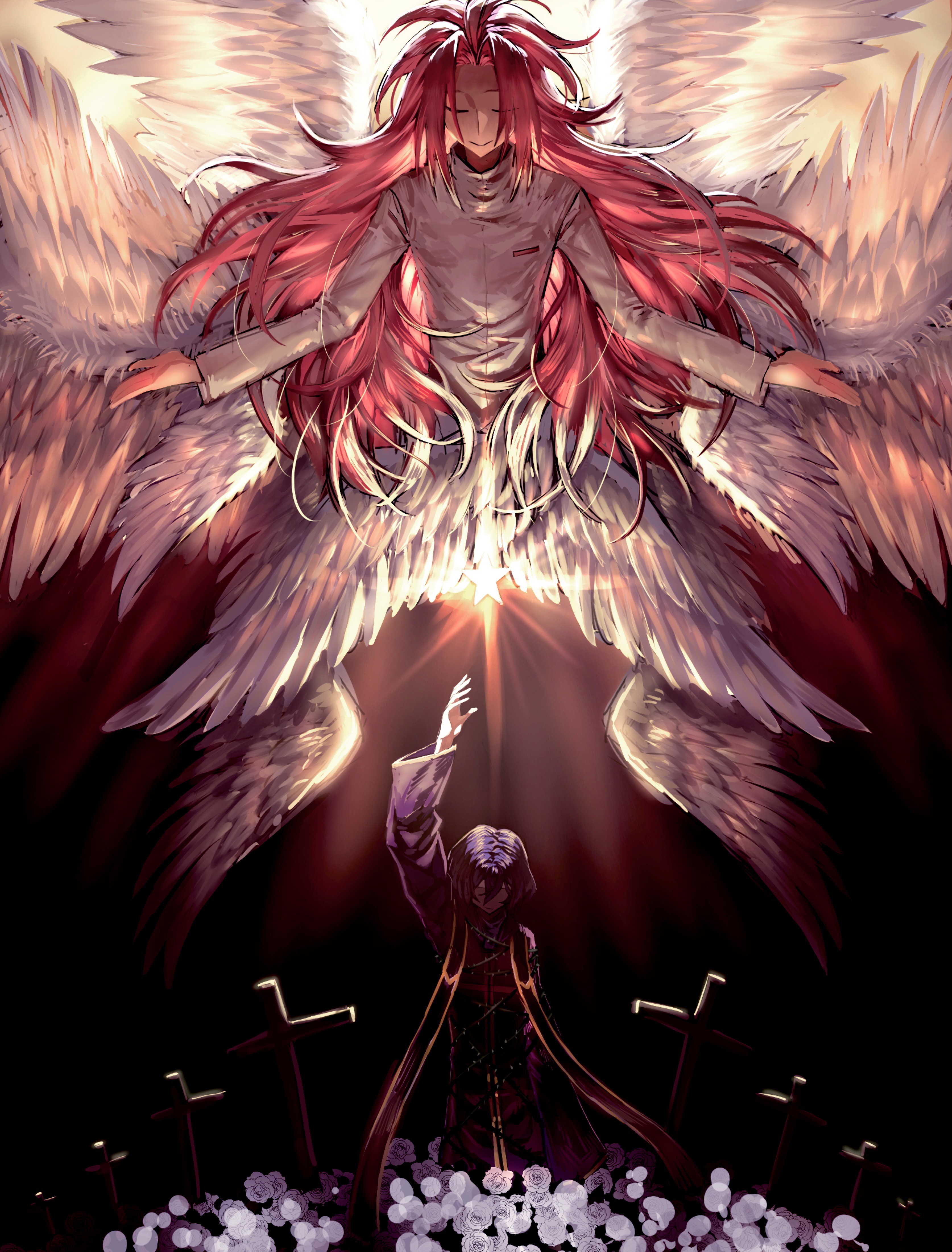2boys absurdres arm_up blue_hair chinese_commentary closed_eyes closed_mouth commentary_request cross dark_blue_hair feathered_wings flower gold_trim hatsutori_hajime highres jcwlg long_hair long_sleeves male_focus multiple_boys multiple_wings parted_bangs pink_hair purple_robe robe rose saibou_shinkyoku shirt smile star_(symbol) stole thorns utsugi_noriyuki white_flower white_rose white_shirt white_wings wings