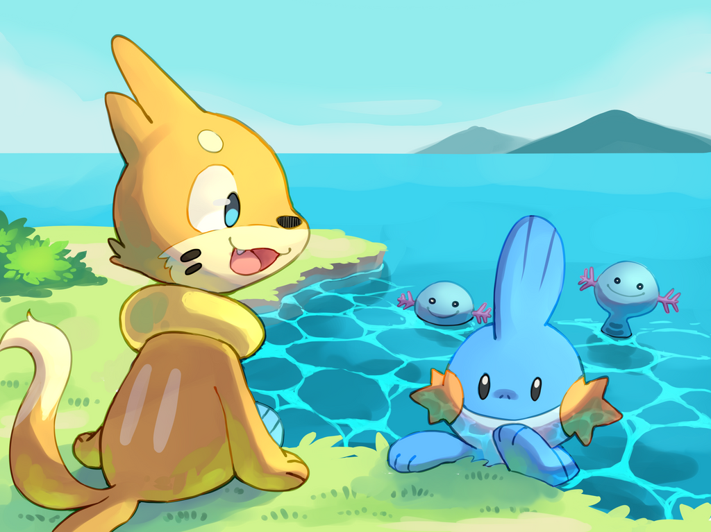 black_eyes blue_eyes buizel closed_mouth facial_mark fang gen_2_pokemon gen_3_pokemon gen_4_pokemon grass mudkip multiple_tails nintendo no_humans open_mouth pokemon pokemon_(creature) sitting smile tail two_tails water whisker_markings wile-z-kitsune wooper