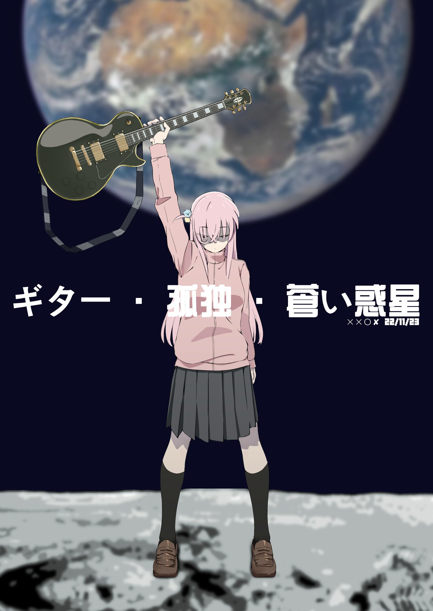 1girl black_socks bocchi_the_rock! brown_shoes closed_eyes closed_mouth commentary cube_hair_ornament dated earth_(planet) electric_guitar full_body gotoh_hitori guitar hair_ornament hashtag-only_commentary highres holding holding_guitar holding_instrument instrument jacket kneehighs loafers long_hair long_sleeves moon pink_hair pink_jacket planet shaded_face shoes socks solo space standing track_jacket translation_request xxox