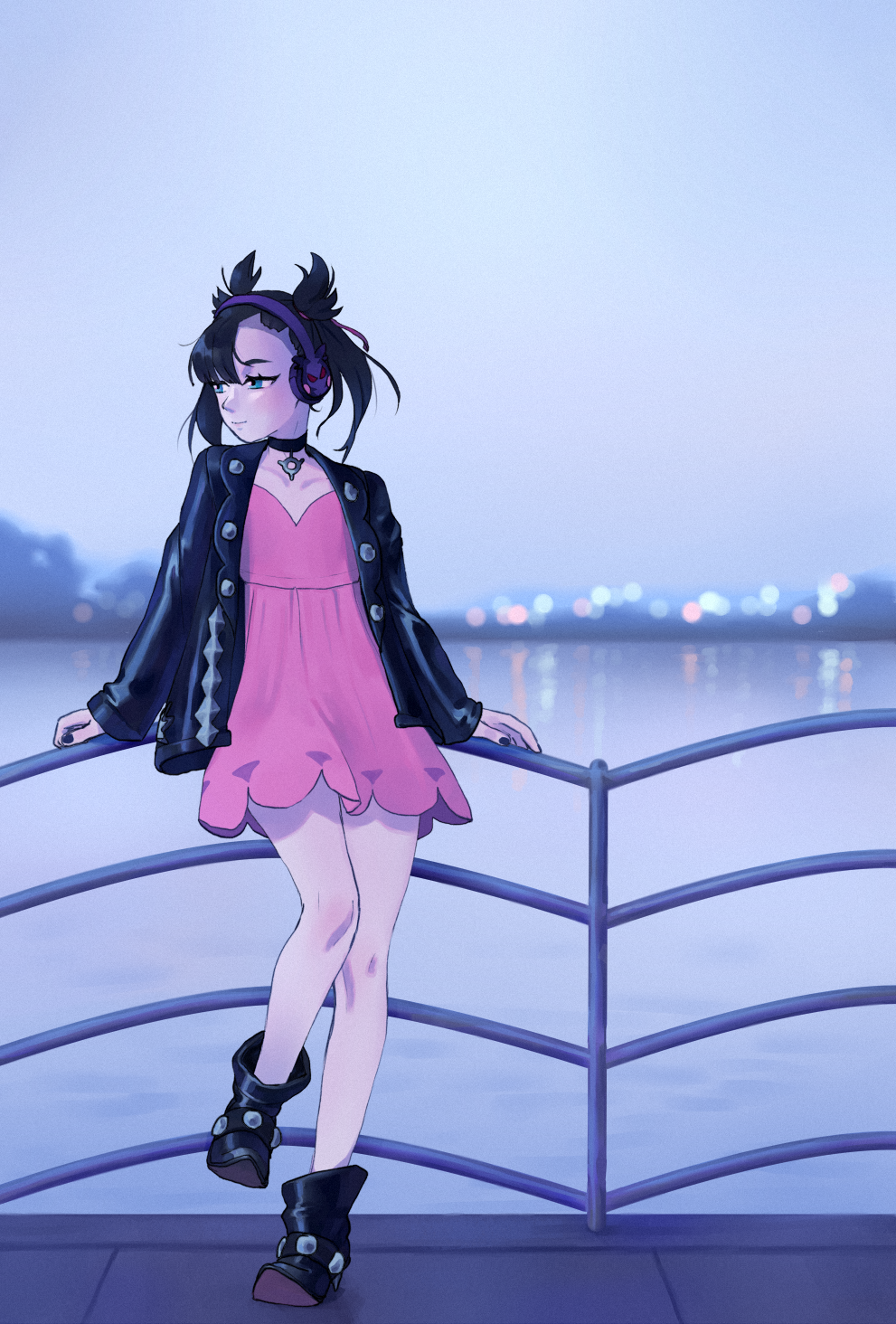 1girl against_railing black_footwear black_hair black_jacket collarbone dress full_body headphones highres jacket jnr.btts light_smile marnie_(pokemon) nail_polish nintendo pendant_choker pink_dress pokemon pokemon_sword_and_shield railing solo