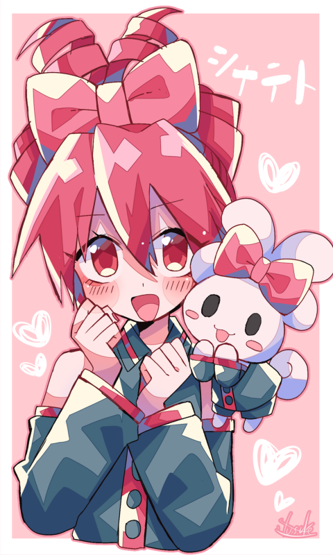 1girl blush bow cinnamiku_hairstyle cinnamoroll collared_shirt cosplay detached_sleeves drill_hair fuwa_fuwa_cinnamoroll hair_bow heart kasane_teto kasane_teto_(cosplay) kasane_teto_(utau) long_sleeves open_mouth pink_background pink_hair red_hair sanrio shirt smile solo translation_request updo utau yuusuke-kun