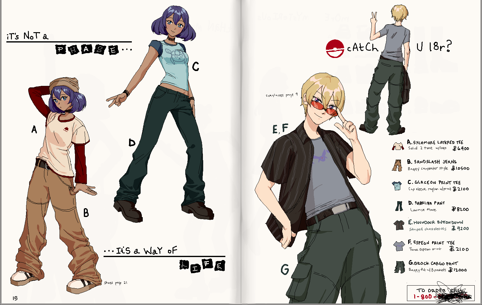 1boy 1girl alternate_costume arm_behind_head beanie belt black_choker black_footwear blonde_hair blue_eyes blue_shirt character_print choker dark-skinned_female dark_skin dexio_(pokemon) english_text espeon gen_2_pokemon gen_4_pokemon glaceon green_pants grey_shirt hat jacket jnr.btts looking_at_viewer midriff_peek nintendo open_clothes open_jacket pants pokemon pokemon_x_and_y purple_hair red-tinted_eyewear shirt simple_background sina_(pokemon) tinted_eyewear v white_background