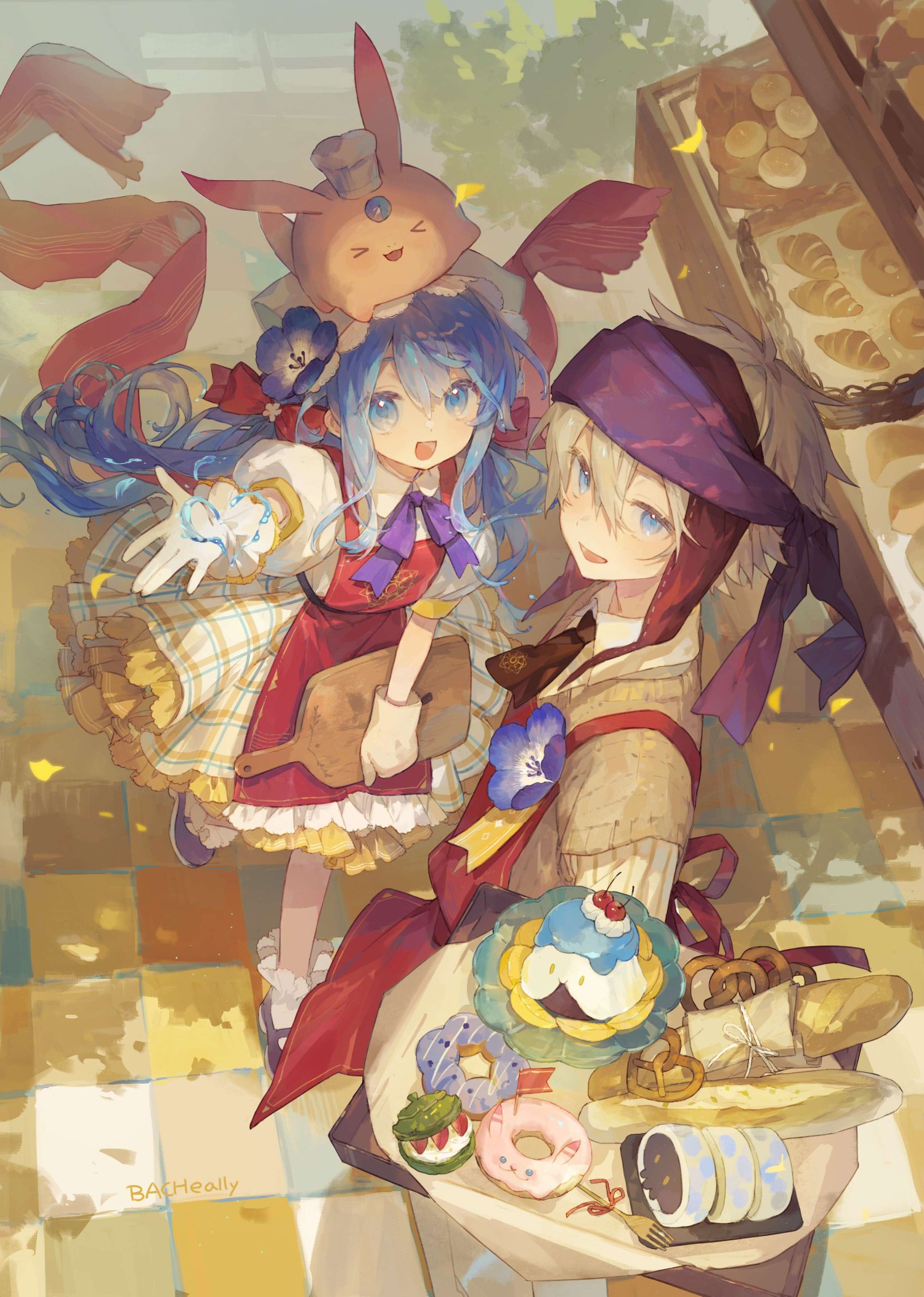 >_< 1boy 1girl :d animal animal_on_head apron artist_name ascot bacheally bandana black_footwear blue_eyes blue_flower blue_hair bow bowtie bread brick_floor cake collared_shirt donut dress floor flower food foot_out_of_frame frilled_dress frills from_above full_body gloves grey_hair hair_between_eyes hair_bow hair_flower hair_ornament hat headscarf height_difference hero_(merc_storia) high_collar highres holding holding_tray leg_up long_hair looking_at_viewer mary_janes merc_(merc_storia) merc_storia necktie on_head open_hand open_mouth plaid_clothes plaid_dress puffy_short_sleeves puffy_sleeves purple_ascot purple_bow rabbit rabbit_on_head reaching reaching_towards_viewer red_apron red_bow ribbon scarf shirt shoes short_hair short_sleeves skirt smile socks standing standing_on_one_leg tray twintails upper_body white_gloves white_hair white_shirt white_socks wing_collar