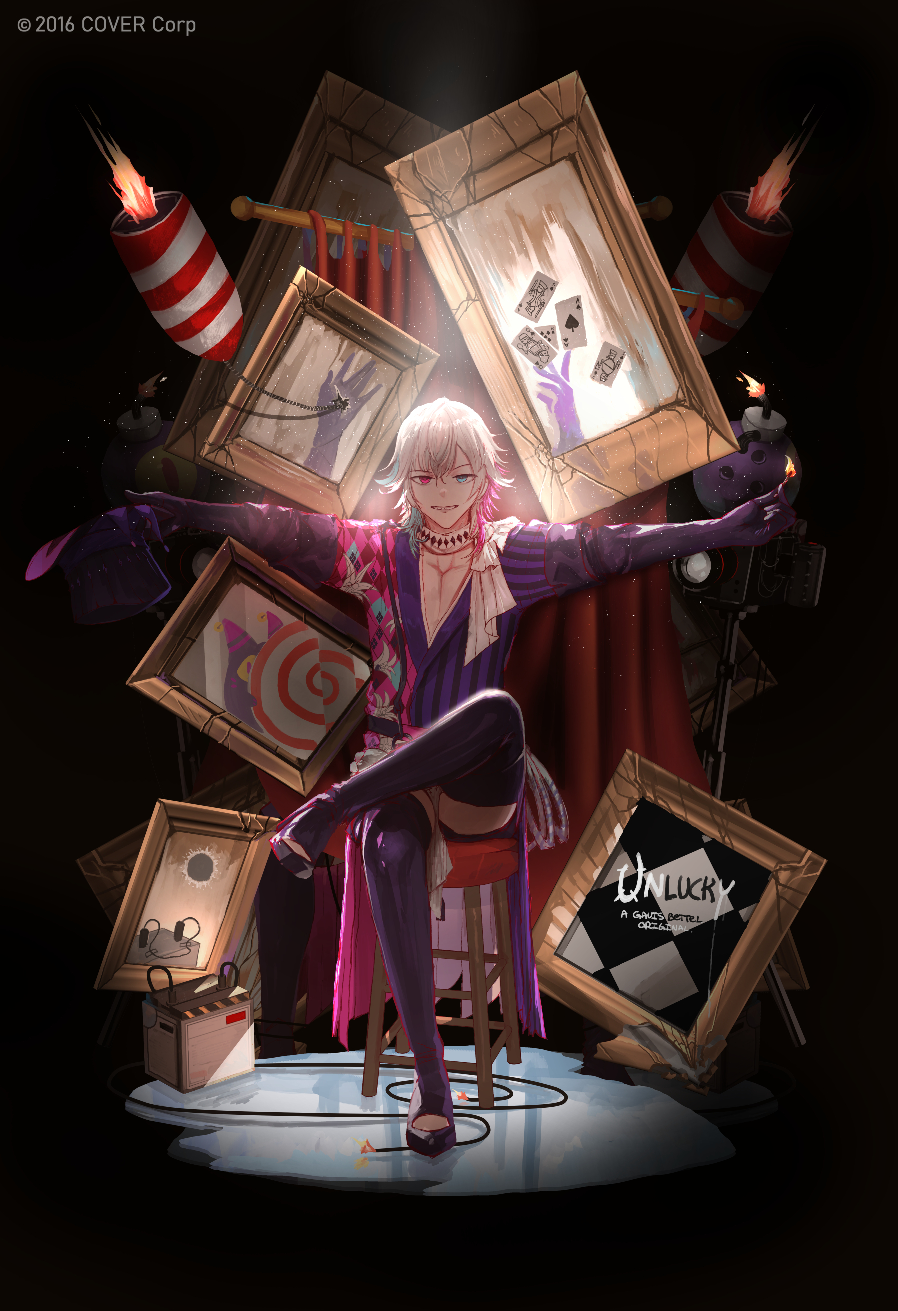 1boy absurdres ace_(playing_card) advarcher asymmetrical_clothes battery blue_eyes blue_hair bomb boots camera card character_name collarbone crossed_legs ear_bell elbow_gloves english_text explosive gavis_bettel gavis_bettel_(1st_costume) gloves hair_between_eyes hat heterochromia highres holding holding_matchstick holding_unworn_clothes holding_unworn_hat holostars holostars_english jack_(playing_card) jester king_(playing_card) male_focus matches medium_hair multicolored_hair one-eyed outstretched_arms phantom_(gavis_bettel) picture_frame pink_eyes playing_card queen_(playing_card) queen_of_spades_(playing_card) scarf smile spread_arms stool striped_clothes thigh_boots top_hat unworn_hat unworn_headwear vertical-striped_clothes virtual_youtuber white_hair white_scarf