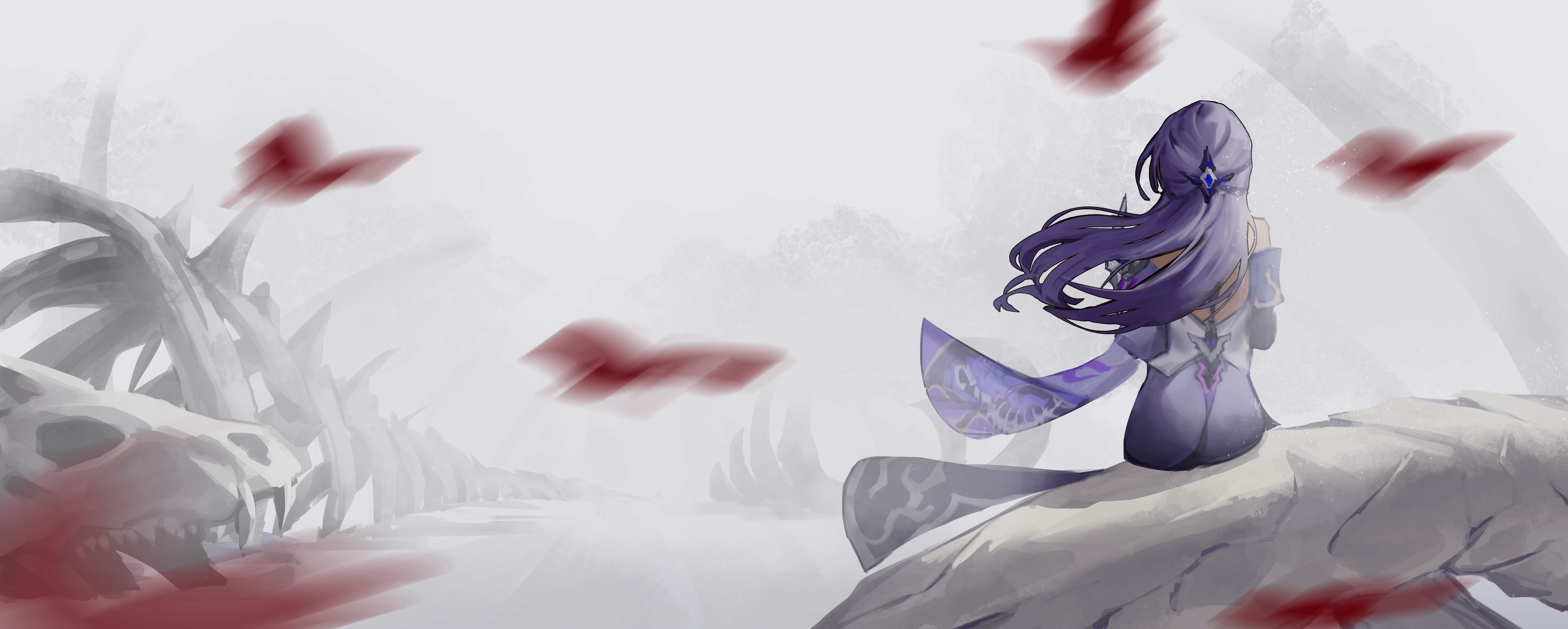 1girl absurdres acheron_(honkai:_star_rail) armor back coat coattails commentary english_commentary from_behind goldenfish hair_ornament highres honkai:_star_rail honkai_(series) long_hair mixed-language_commentary petals purple_hair red_petals shoulder_armor single_bare_shoulder single_wide_sleeve sitting solo tailcoat white_coat
