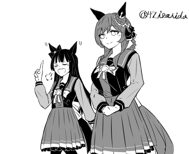 2girls animal_ears bow bowtie braid braided_hair_rings closed_eyes commentary deep_impact_(umamusume) ear_bow ear_covers ear_ornament ear_wiggle gentildonna_(umamusume) greyscale hair_rings height_difference horse_ears horse_girl horse_tail index_finger_raised isarida long_hair long_sleeves monochrome motion_lines multiple_girls open_mouth pleated_skirt puff_of_air sailor_collar sailor_shirt school_uniform shirt sidelocks sideways_glance sketch skirt smug tail teeth tracen_school_uniform twitter_username umamusume umamusume_horse_relations upper_teeth_only waist_bow winter_uniform