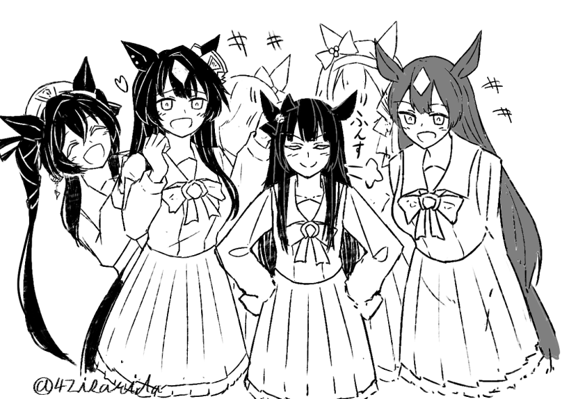 +++ 6+girls bow bowtie closed_eyes collarbone commentary deep_impact_(umamusume) ear_bow ears_through_headwear genjitsu_steel_(umamusume) greyscale hairband hands_on_own_hips hat heart height_difference isarida leaning_to_the_side long_hair long_sleeves mini_hat monochrome multicolored_hair multiple_girls navel pleated_skirt puff_of_air river_light_(umamusume) sailor_collar sailor_hat sailor_shirt satono_diamond_(umamusume) school_uniform shirt sidelocks sketch skirt smug tilted_headwear tracen_school_uniform twintails twitter_username umamusume umamusume_horse_relations verxina_(umamusume) very_long_hair vivlos_(umamusume) winter_uniform