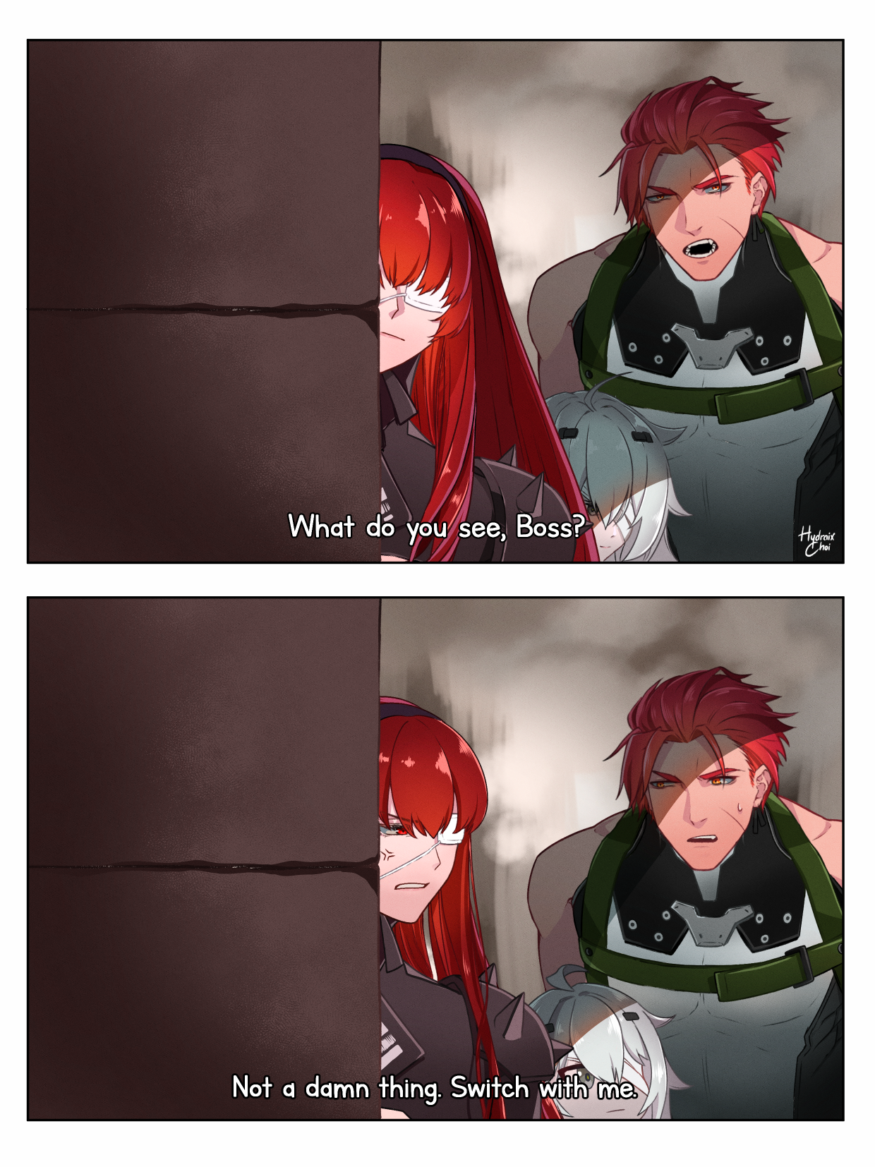 1boy 2girls english_text eyepatch highres hydraix_choi image_sample multiple_girls no._21:_xxi_(pgr) no._21_(pgr) noctis_(pgr) peeking peeking_out pixiv_sample punishing:_gray_raven speech_bubble vera:_garnet_(pgr) vera_(pgr)