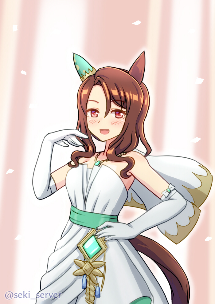 1girl animal_ears bare_shoulders brown_hair dress ear_covers hand_on_own_hip horse_ears horse_girl horse_tail jewelry king_halo_(evergreen_identity)_(umamusume) king_halo_(umamusume) looking_at_viewer necklace official_alternate_costume red_eyes seki_(hyokosho) single_ear_cover smile solo tail umamusume white_dress