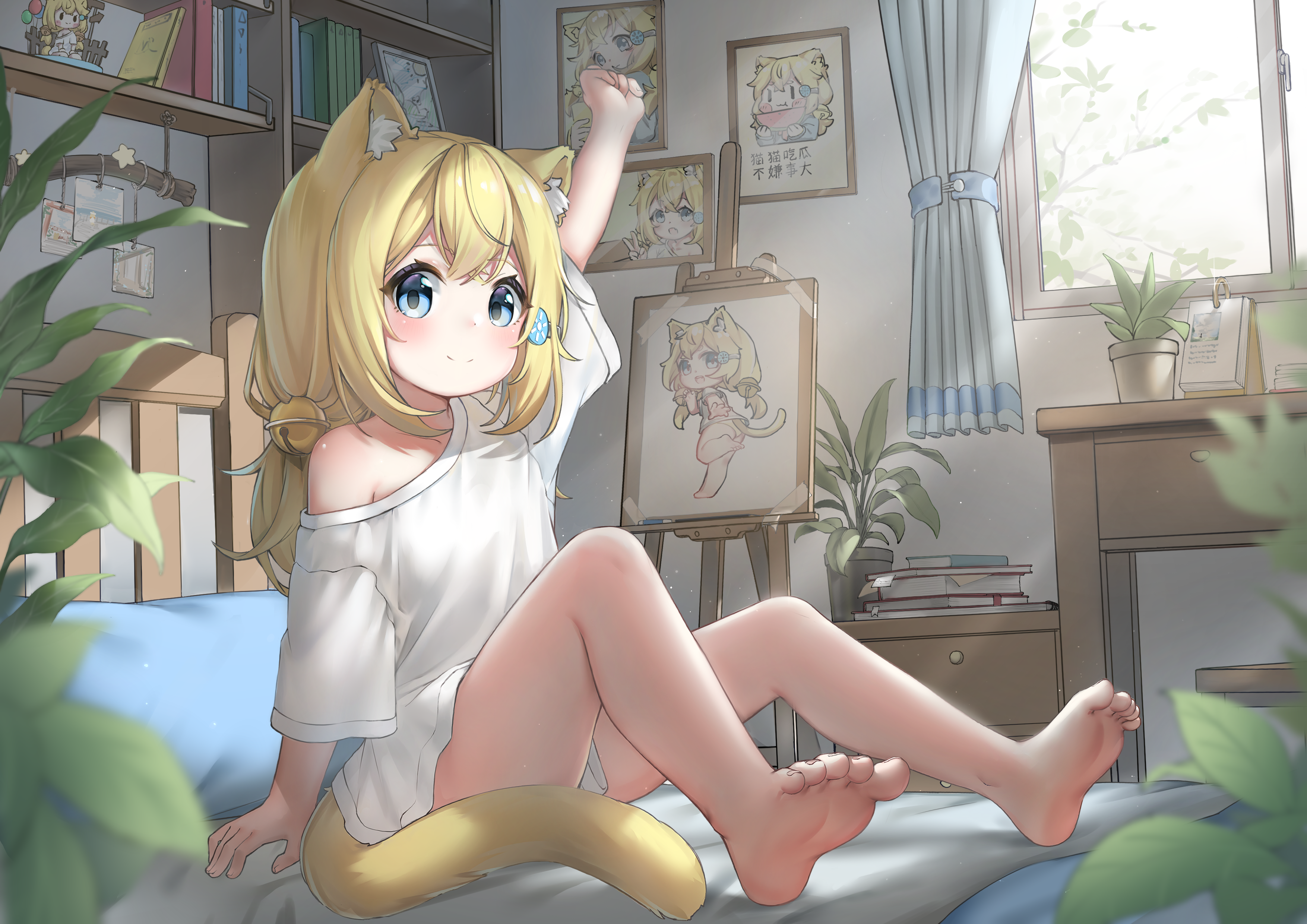 1girl absurdres animal_ear_fluff animal_ears arm_up bare_legs barefoot bed bell blonde_hair blue_eyes blurry book book_stack bookshelf cat_ears cat_girl cat_tail character_doll curtains depth_of_field desk doll feet full_body hair_bell hair_ornament highres indoors jingle_bell long_hair looking_at_viewer naked_shirt nightstand no_pants off_shoulder on_bed original painting_(object) picture_frame plant potted_plant shirt short_sleeves sitting soles extendable_limbs tail toes white_shirt window xiao_baixiong_tat