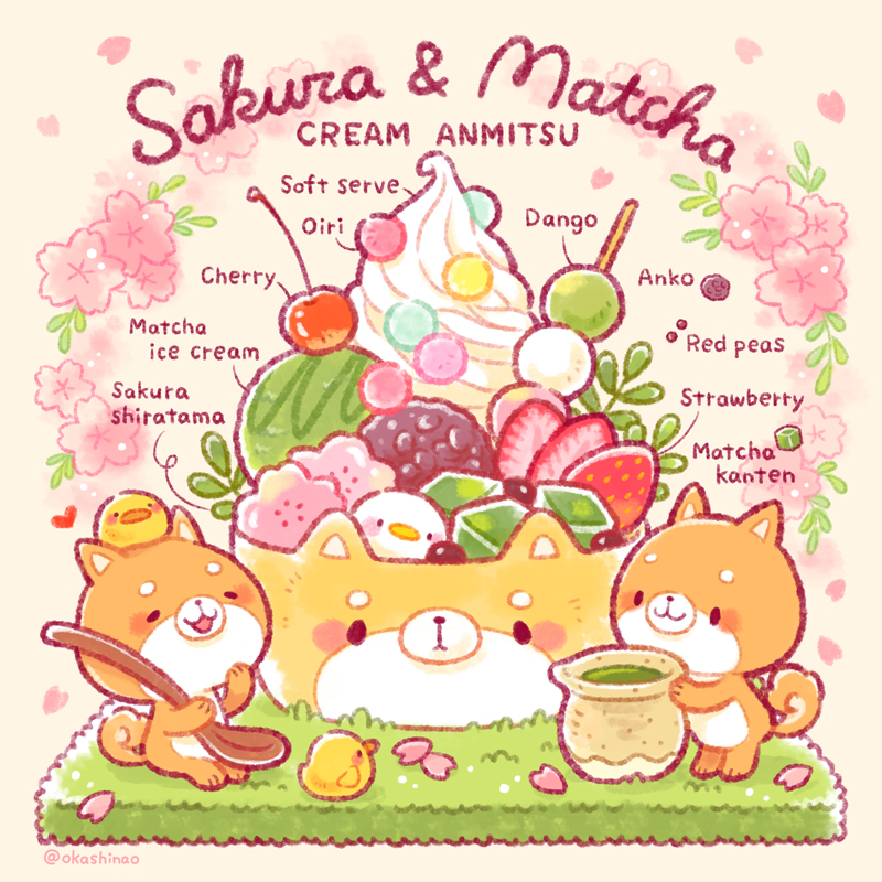 animal-themed_food animal_focus anmitsu_(dessert) baby_animal bad_id bad_twitter_id bird cherry cherry_blossoms chick commentary dango dog english_text floral_background flower food food_focus fruit gelatin hashtag-only_commentary holding holding_spoon ice_cream matcha_(food) no_humans okashi_nao original oversized_food oversized_object petals pink_flower sanshoku_dango shiba_inu simple_background sitting spoon standing strawberry strawberry_slice wagashi white_background