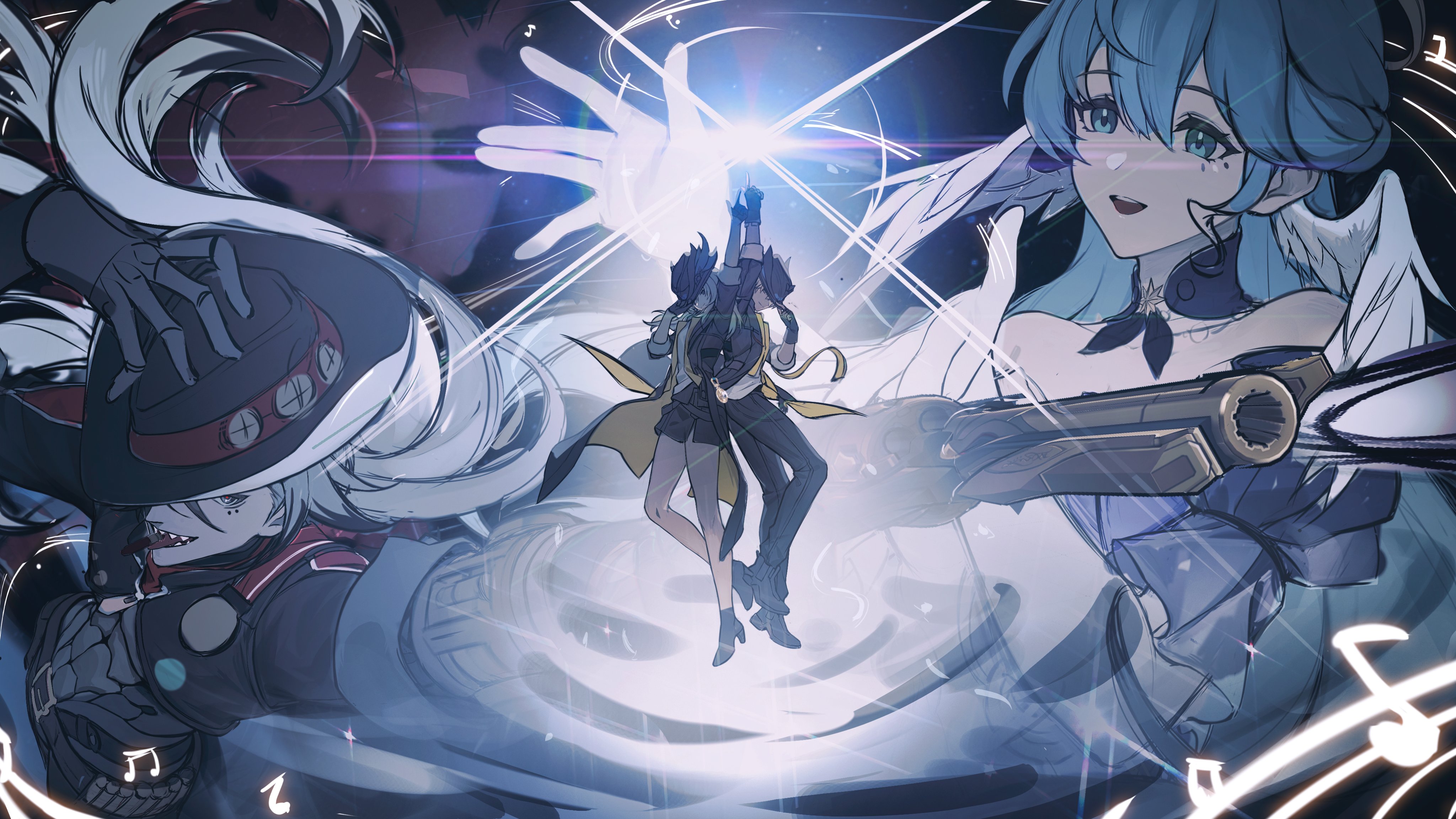 2boys 2girls absurdres arm_up armor back-to-back bare_shoulders belt black_belt black_coat black_footwear black_gloves black_hair black_hat black_jacket black_pants black_skirt blue_eyes blue_hair boothill_(honkai:_star_rail) boots caelus_(honkai:_star_rail) closed_mouth coat collarbone detached_sleeves dress elbow_gloves feathered_wings fingerless_gloves flying full_body gloves grey_eyes grey_hair gun hair_between_eyes halo hand_on_headwear hand_up handgun hat hat_feather head_wings high_heels highres holding holding_gun holding_weapon honkai:_star_rail honkai_(series) hood hooded_jacket index_finger_raised jacket jewel_under_eye light long_hair long_sleeves looking_at_another looking_at_viewer multicolored_hair multiple_boys multiple_girls musical_note open_clothes open_coat open_mouth pants pocket_watch purple_dress robin_(honkai:_star_rail) sharp_teeth shirt short_hair short_sleeves skirt smile star_(symbol) star_ornament stelle_(honkai:_star_rail) t-shirt teeth tongue tongue_out trailblazer_(honkai:_star_rail) two-sided_coat two-sided_fabric two-sided_jacket two-tone_dress two-tone_hair unfinished watch weapon white_dress white_gloves white_hair white_shirt wings yellow_coat yellow_jacket zhiyan_li
