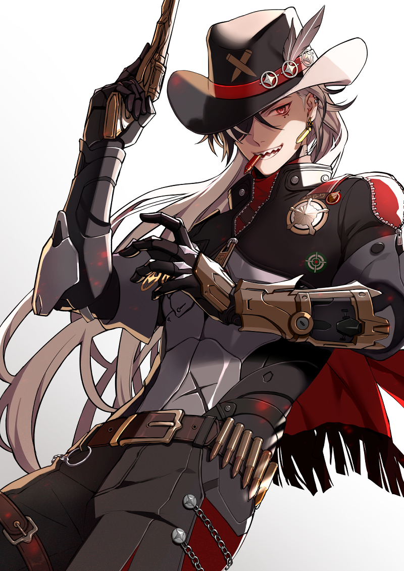 1boy belt belt_buckle black_hair black_hat boothill_(honkai:_star_rail) brown_belt buckle bullet bullet_earrings cyborg ear_piercing earrings gun hair_over_one_eye hat hat_feather holding holding_gun holding_weapon honkai:_star_rail honkai_(series) jewelry long_hair male_focus minato_(robin) multicolored_hair piercing police_badge shrug_(clothing) solo split-color_hair weapon white_background white_hair zipper