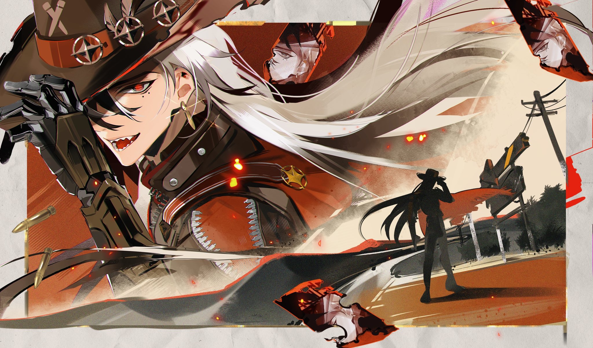 1boy black_hair black_hat boothill_(honkai:_star_rail) ear_piercing earrings hair_over_one_eye hat hat_feather highres honkai:_star_rail honkai_(series) jewelry long_hair male_focus multicolored_hair open_mouth piercing red_eyes sharp_teeth solo split-color_hair teeth two-tone_hair violetpuppy1 white_hair