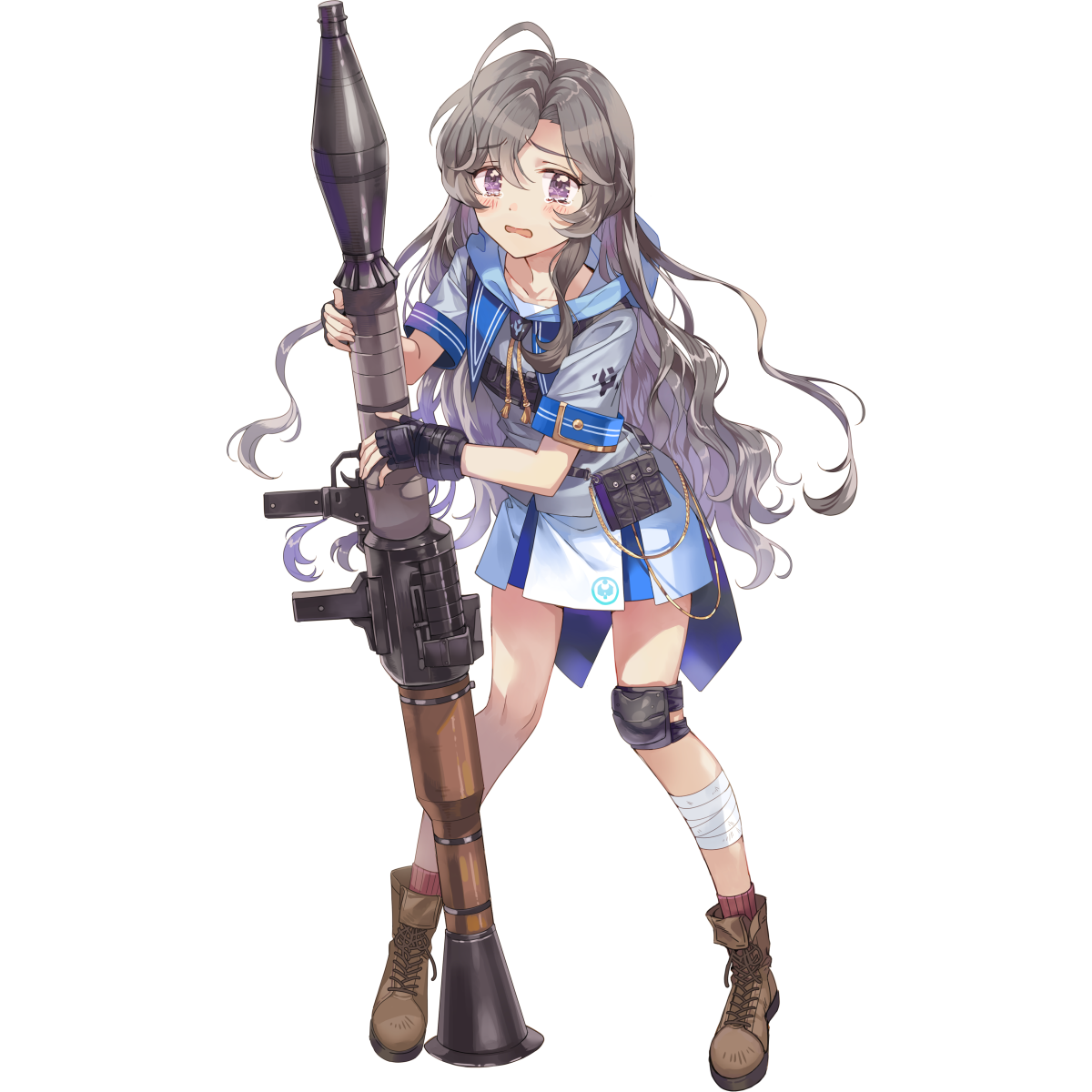 1girl ahoge aqua_hood artist_request black_gloves blue_sailor_collar blush buttoned_cuffs buttons collarbone crying final_gear fingerless_gloves full_body gloves grey_hair hair_intakes highres holding holding_rocket_launcher holding_weapon knee_pads leg_wrap legs_apart logo_print long_hair long_sidelocks looking_at_viewer official_art open_mouth pleated_skirt pouch purple_eyes rocket_launcher sailor_collar shirt short_sleeves sidelocks simple_background single_knee_pad skirt solo standing tachi-e tassel tears third-party_source transparent_background very_long_hair wavy_hair weapon white_shirt white_skirt white_sleeves zoi_(final_gear)