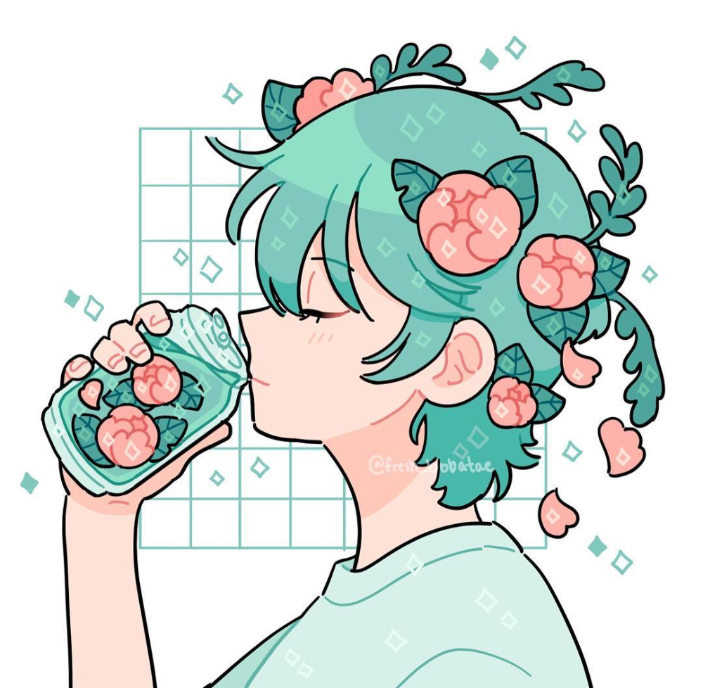 1boy can closed_eyes closed_mouth drink drink_can drinking emily_kim expressionless eyelashes flower from_side green_hair hair_flower hair_ornament holding holding_drink instagram_username leaf male_focus original petals pink_flower shirt short_hair short_sleeves simple_background soda_can solo source_request sparkle t-shirt third-party_source upper_body white_background white_shirt