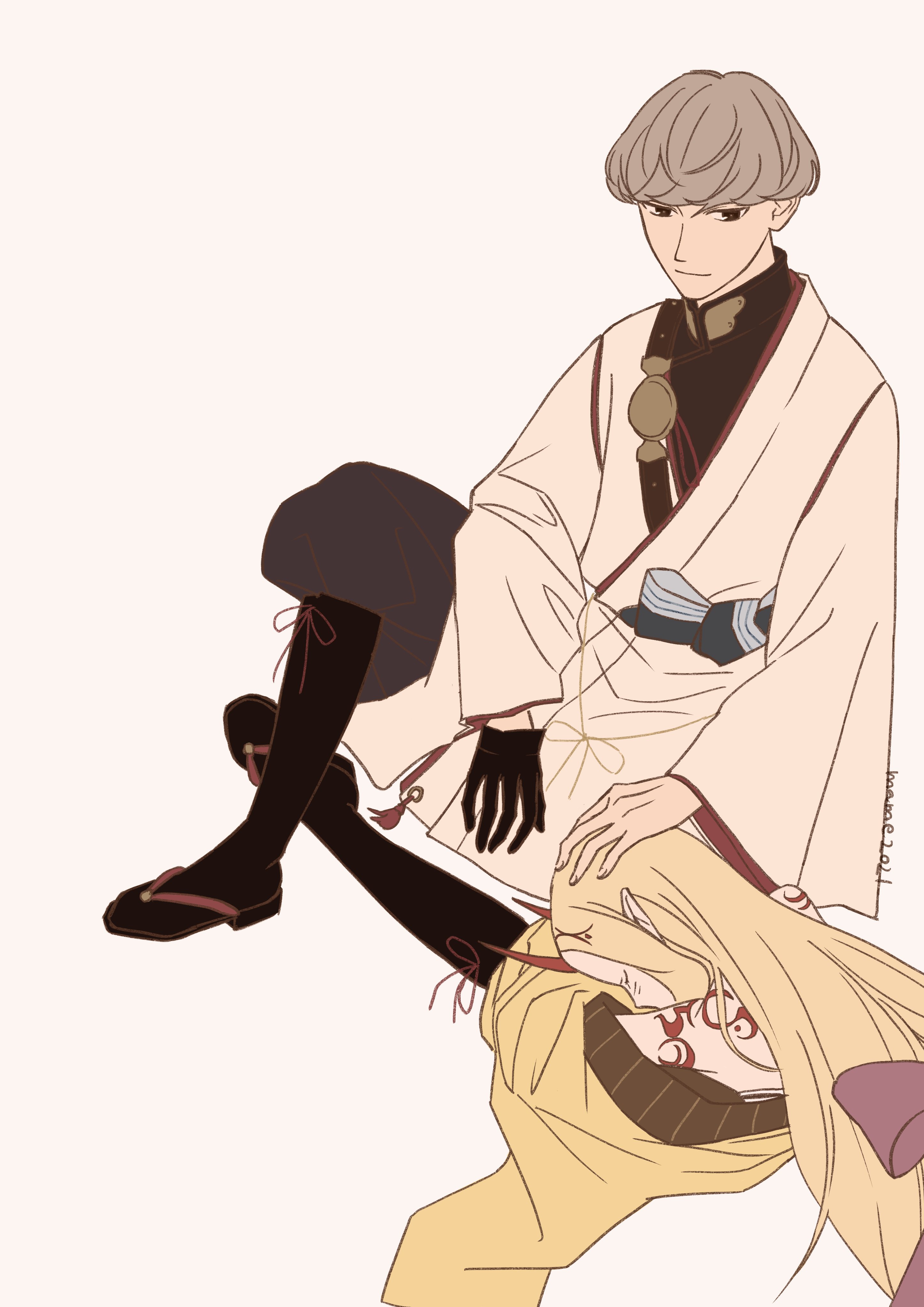 1boy 1girl absurdres black_eyes blonde_hair closed_eyes fate/grand_order fate_(series) grey_hair highres horns ibaraki_douji_(fate) japanese_clothes kimono looking_at_another mame_cs5 oni pointy_ears sleeping watanabe_no_tsuna_(fate) yellow_kimono