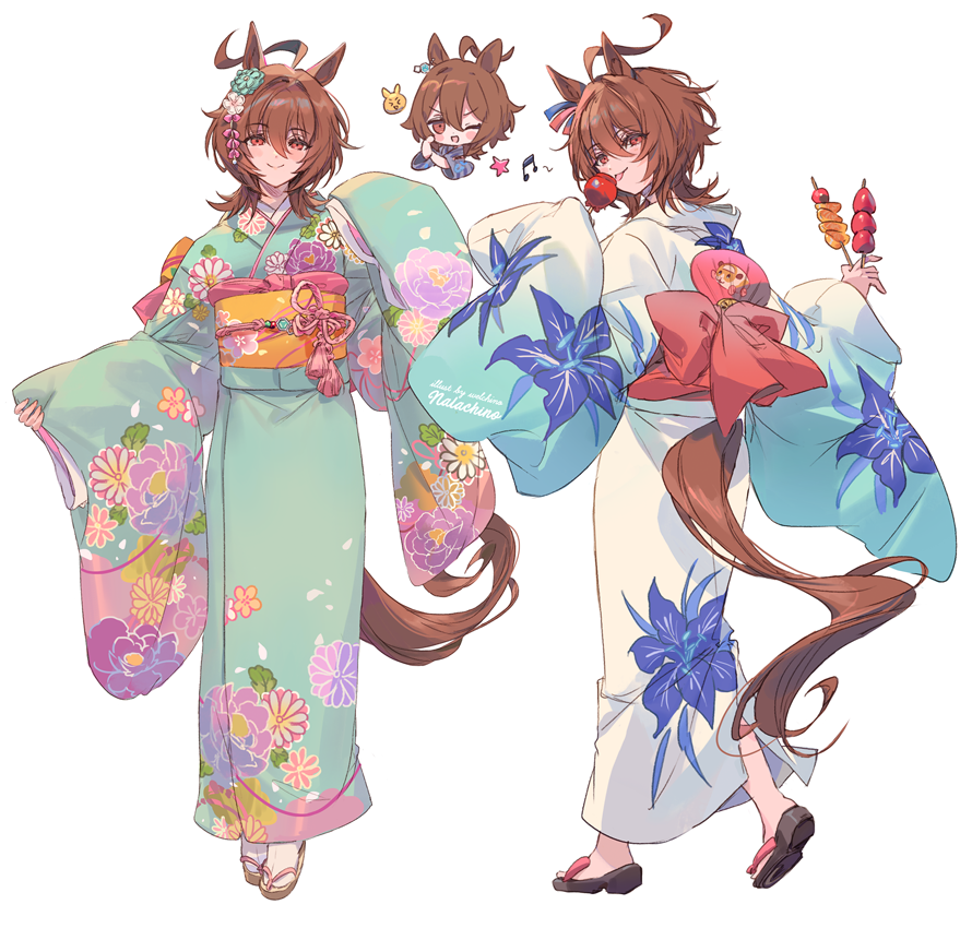 1girl agnes_tachyon_(umamusume) ahoge animal_ears blue_kimono brown_hair candy_apple chibi chibi_inset closed_mouth eighth_note flower food green_kimono hair_between_eyes hair_flower hair_ornament holding holding_candy_apple holding_food holding_skewer horse_ears horse_girl horse_tail japanese_clothes kimono licking_lips long_sleeves looking_at_viewer medium_hair multiple_views musical_note obi red_eyes sandals sash simple_background skewer smile tabi tail tongue tongue_out tracen_ondo_outfit_(umamusume) umamusume welchino white_background wide_sleeves yukata