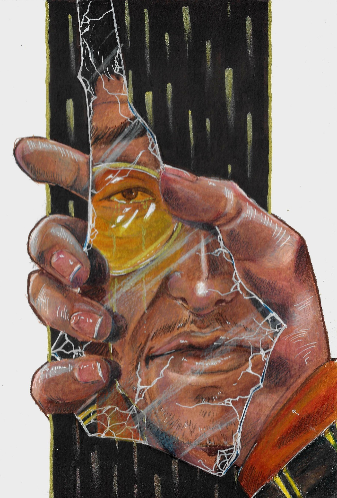 1boy black_hair brown_eyes colored_pencil_(medium) commentary english_commentary eriathalia facial_hair glass_shard goatee hand_focus highres holding_glass_shard kizaru_(one_piece) male_focus mustache one_piece reflection striped_clothes sunglasses thick_lips tinted_eyewear traditional_media vertical-striped_clothes yellow-tinted_eyewear