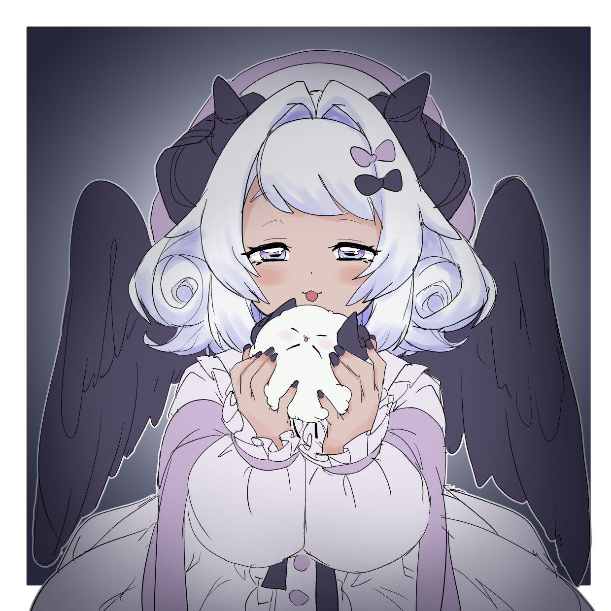 1girl :3 akichi_360 amaryllis_gumi black_background black_nails black_wings blush border breasts cowboy_shot creature curled_horns curly_hair dark-skinned_female dark_skin demon_horns dress hair_intakes half-closed_eyes hands_up highres holding holding_creature horizontal_pupils horns long_sleeves looking_at_viewer medium_breasts open_mouth outside_border purple_eyes purple_shawl raised_eyebrows shawl solo standing straight-on virtual_youtuber white_border white_dress wings yotsutsuji_mayoi