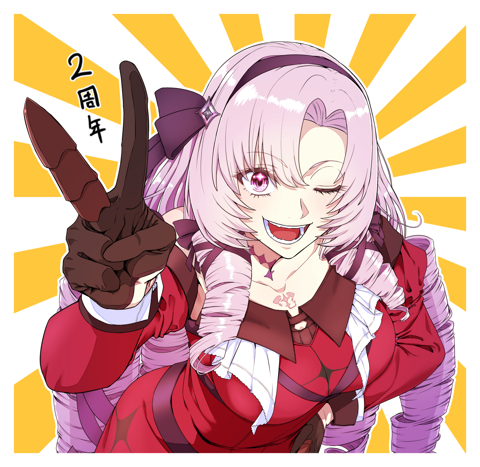 1girl birii black_gloves breasts drill_hair gloves hand_on_own_hip highres hyakumantenbara_salome long_hair long_sleeves looking_at_viewer nijisanji one_eye_closed puffy_long_sleeves puffy_sleeves purple_eyes purple_hair smile solo v virtual_youtuber