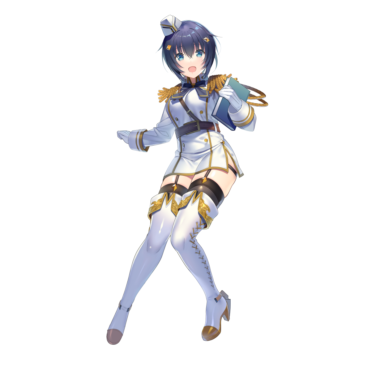 1girl aiguillette artist_request belt belt_buckle black_garter_straps black_thighhighs blue_hair blue_ribbon book boots breasts brown_belt buckle buttons collar dark_blue_hair double-breasted double_horizontal_stripe epaulettes final_gear full_body garrison_cap garter_straps gloves gold_buckle green_eyes hair_between_eyes hair_ornament hat high_heel_boots high_heels highres holding holding_book lace-up_boots light_blush long_sleeves looking_at_viewer medium_breasts military_uniform neck_ribbon no_pants official_art open_mouth ribbon short_hair side_slit simple_background solo striped_ribbon tachi-e thigh_boots thighhighs third-party_source transparent_background vivine_(final_gear) white_boots white_collar white_gloves white_hair white_sleeves white_uniform
