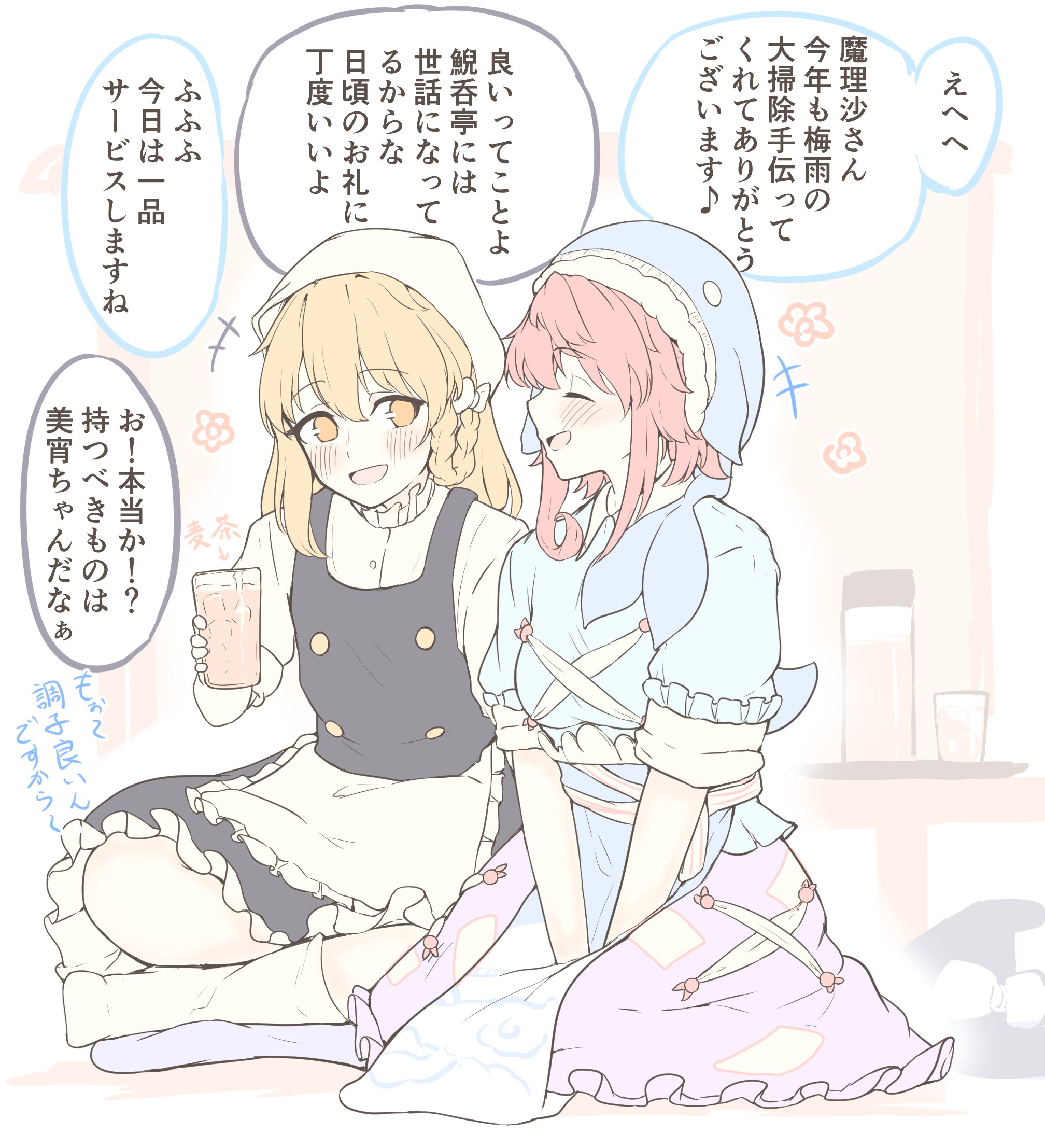 +++ 2girls :d apron arrow_(symbol) bandana black_skirt black_vest blonde_hair blue_apron blue_hat blue_shirt blush bow braid closed_eyes commentary_request cup drinking_glass flat_color frilled_apron frilled_shirt_collar frilled_skirt frills full_body hair_bow hand_up hat highres holding holding_cup kirisame_marisa kneehighs long_hair looking_at_another multiple_girls no_shoes okunoda_miyoi open_mouth pink_hair pink_skirt profile seele_(chanseele0128) shirt short_hair short_sleeves sitting skirt smile socks speech_bubble split_mouth talking touhou translation_request v_arms vest waist_apron white_apron white_bow white_shirt white_socks yellow_eyes