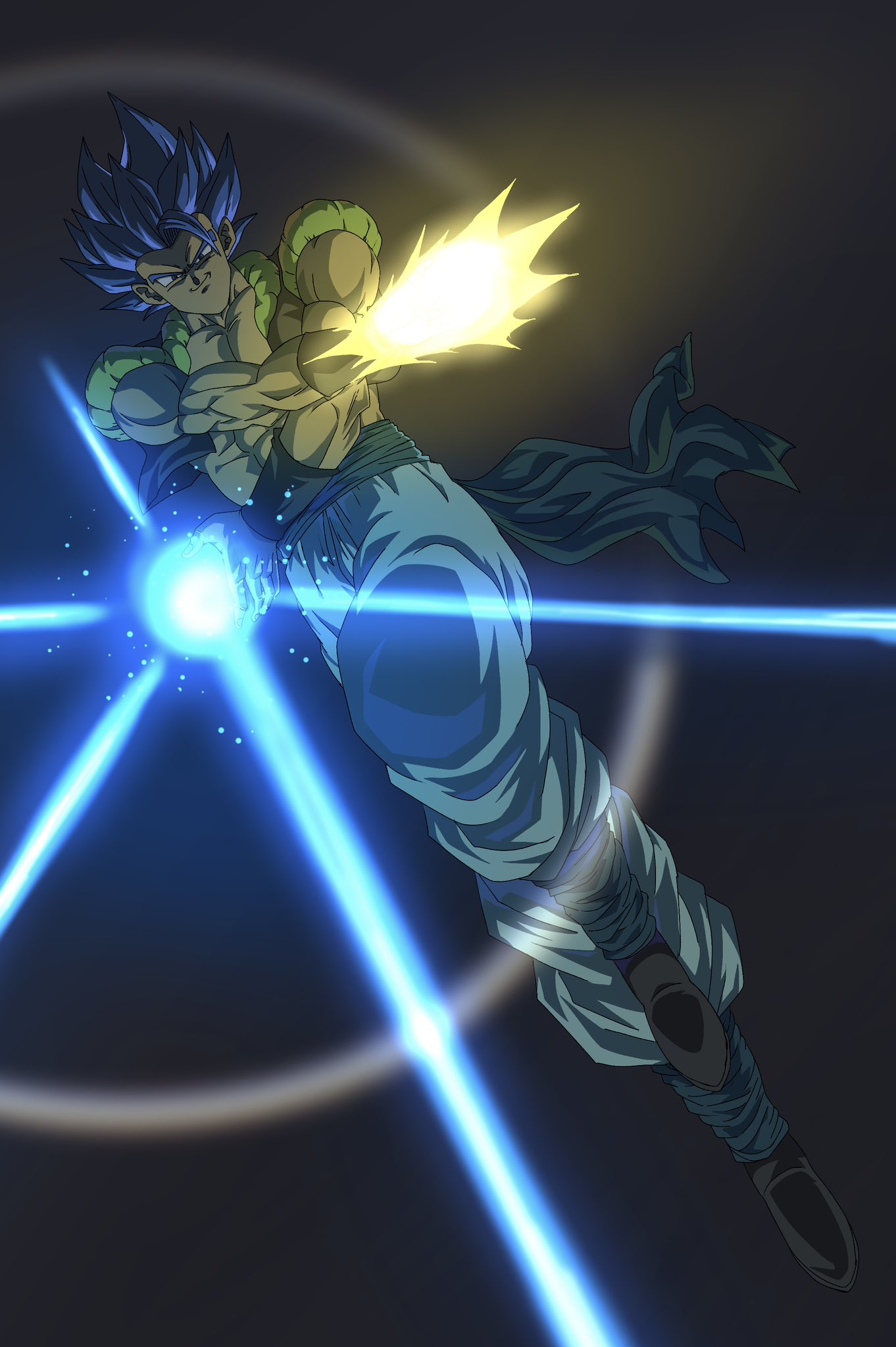 1boy aura black_vest blue_eyes blue_hair blue_sash cropped_vest dark_background dragon_ball dragon_ball_super dragon_ball_super_broly dragon_ball_z_dokkan_battle energy glowing gogeta highres kazumax76 male_focus medium_hair muscular muscular_male pants sash solo spiked_hair super_saiyan super_saiyan_blue vest white_pants