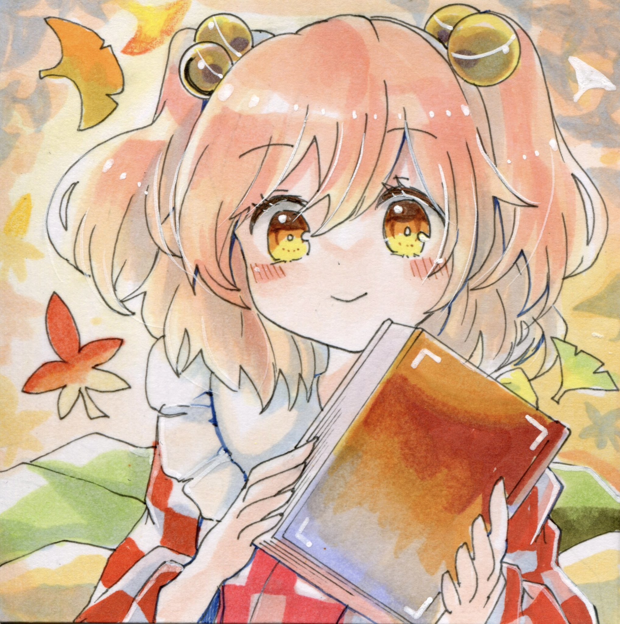 1girl bell book closed_mouth commentary_request hair_bell hair_ornament happy highres holding holding_book japanese_clothes jingle_bell kimono leaf long_sleeves looking_at_viewer motoori_kosuzu orange_eyes red_hair red_kimono smile solo torajirou_(toraneko_zirou) touhou traditional_media two_side_up upper_body white_kimono wide_sleeves