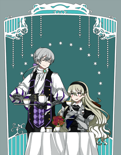 1boy 1girl aristocratic_clothes black_hairband butler female_corrin_(fire_emblem) fire_emblem fire_emblem_fates grey_hair hairband hio141 jakob_(fire_emblem) low_ponytail nintendo pointy_ears ponytail tea_set teapot tuxedo_shirt
