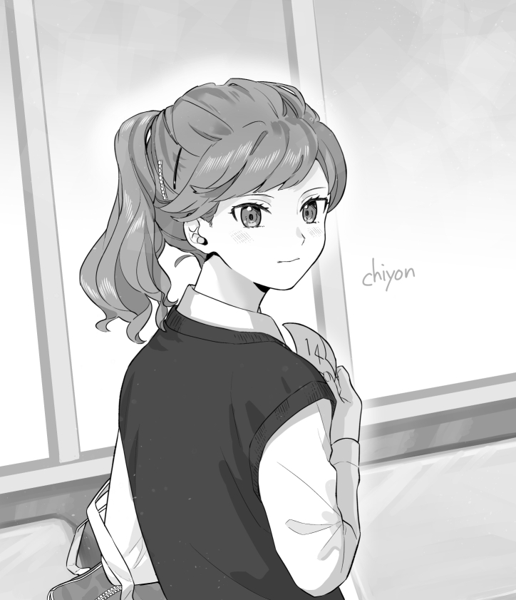 1girl bag chon_chiyon closed_mouth collared_shirt eyelashes greyscale holding holding_paper long_hair long_sleeves looking_at_viewer looking_back monochrome original paper ponytail school_uniform shirt signature solo sweater_vest upper_body