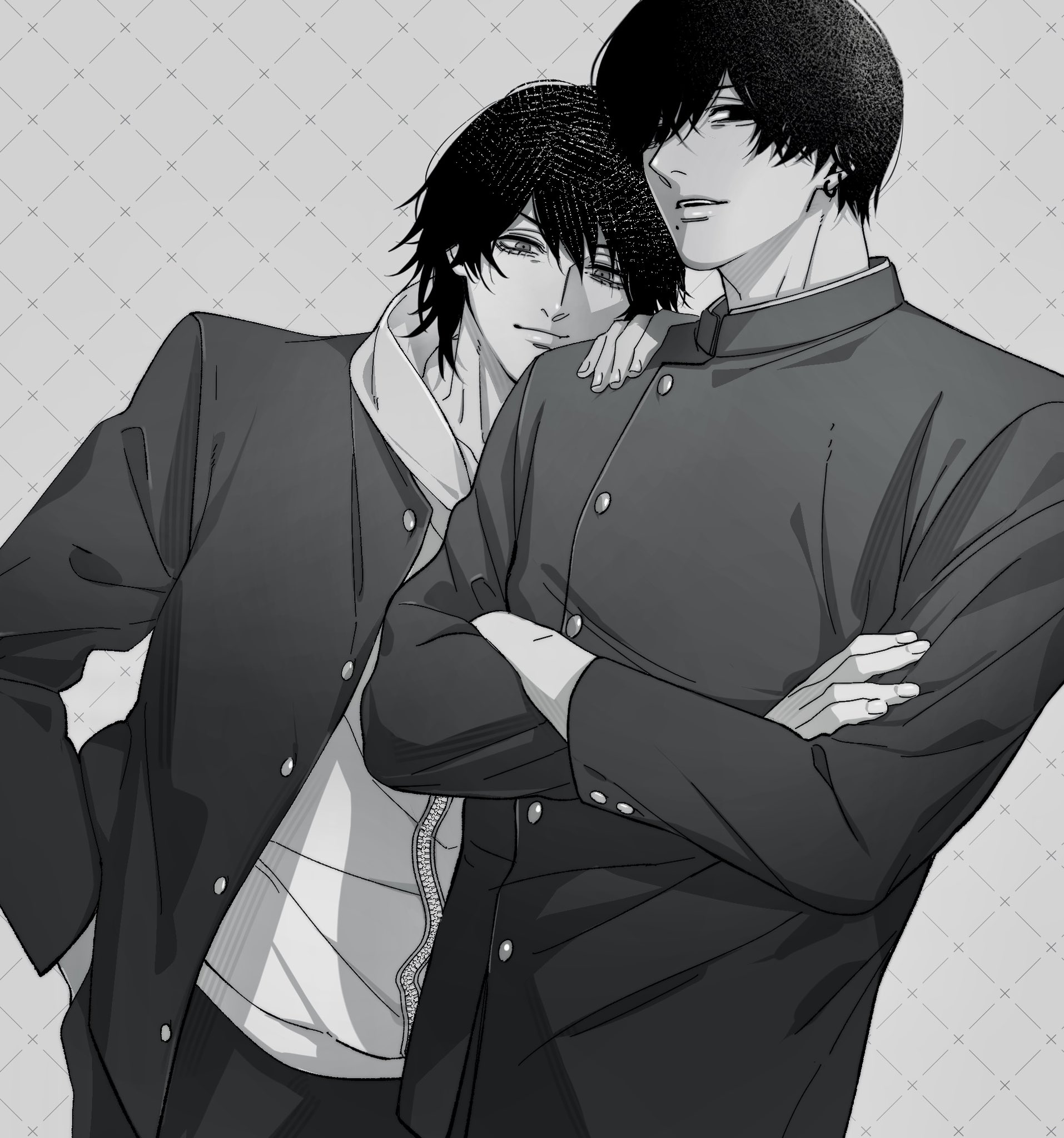 2boys black_eyes black_hair black_jacket black_pants chainsaw_man closed_mouth fourth_east_high_school_uniform grey_background grey_eyes grey_hoodie greyscale grid_background hair_between_eyes hair_over_one_eye hand_on_another's_shoulder highres hood hood_down hoodie jacket light_smile male_focus mole mole_under_mouth monochrome multiple_boys open_clothes open_jacket pants parted_lips school_uniform siraco_(sira5_3) sugo_miri teeth upper_body yoshida_hirofumi