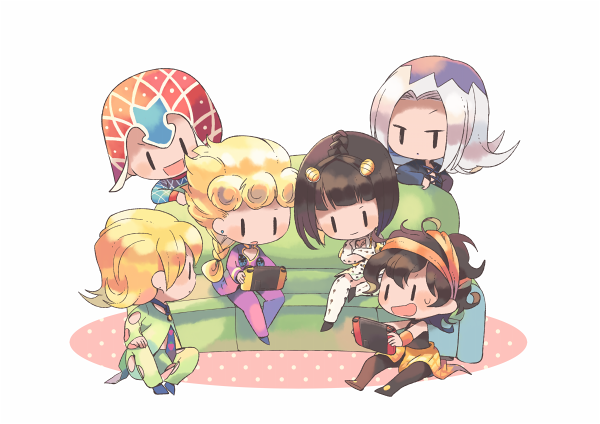 6+boys black_hair blonde_hair blush_stickers braid bruno_bucciarati chibi couch crossed_arms earrings giorno_giovanna guido_mista hair_ornament handheld_game_console hat headband hitofutarai holding holding_handheld_game_console jewelry jojo_no_kimyou_na_bouken leone_abbacchio long_hair long_sleeves male_focus multiple_boys narancia_ghirga necktie nintendo_switch open_mouth pannacotta_fugo short_hair sitting smile solid_oval_eyes vento_aureo white_hair