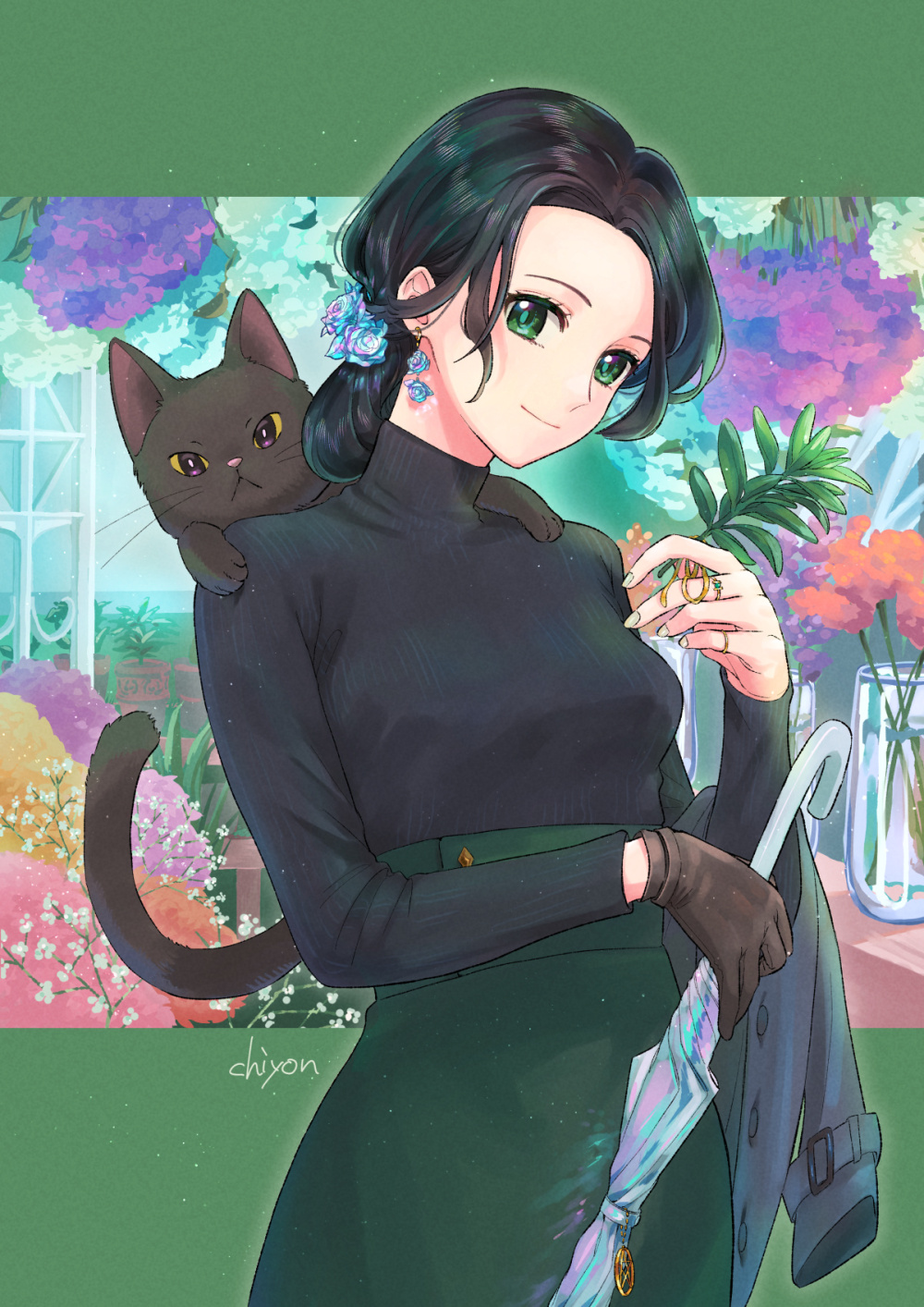 1girl animal animal_on_shoulder black_cat black_hair black_sweater brown_gloves cat cat_on_shoulder chon_chiyon closed_mouth closed_umbrella colored_sclera flower gloves green_eyes grey_jacket highres holding holding_plant jacket jewelry looking_at_viewer original plant purple_flower red_flower ribbed_sweater single_glove smile solo sweater umbrella unworn_jacket yellow_sclera