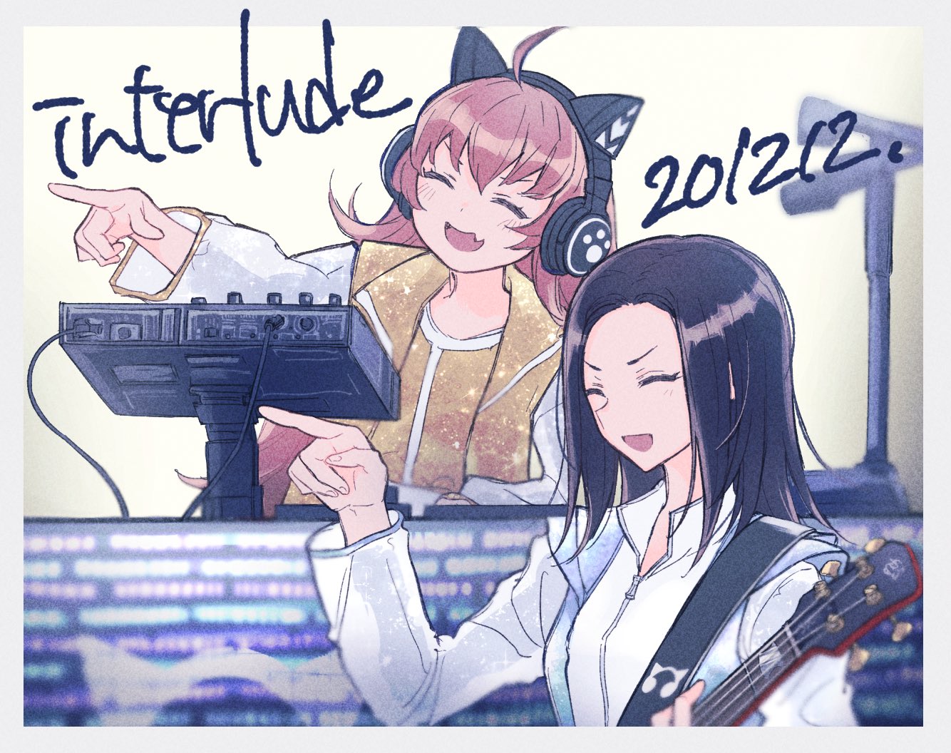 2girls :d ^_^ ahoge animal_ear_headphones animal_ears bad_id bad_twitter_id bang_dream! bang_dream!_girls_band_party! black_hair border cat_ear_headphones cat_ears closed_eyes dated fake_animal_ears fang guitar hand_up headphones holding holding_guitar holding_instrument instrument jacket long_hair long_sleeves multiple_girls open_mouth pointing red_hair shiontaso shirt skin_fang smile tamade_chiyu upper_body wakana_rei white_border white_jacket white_shirt