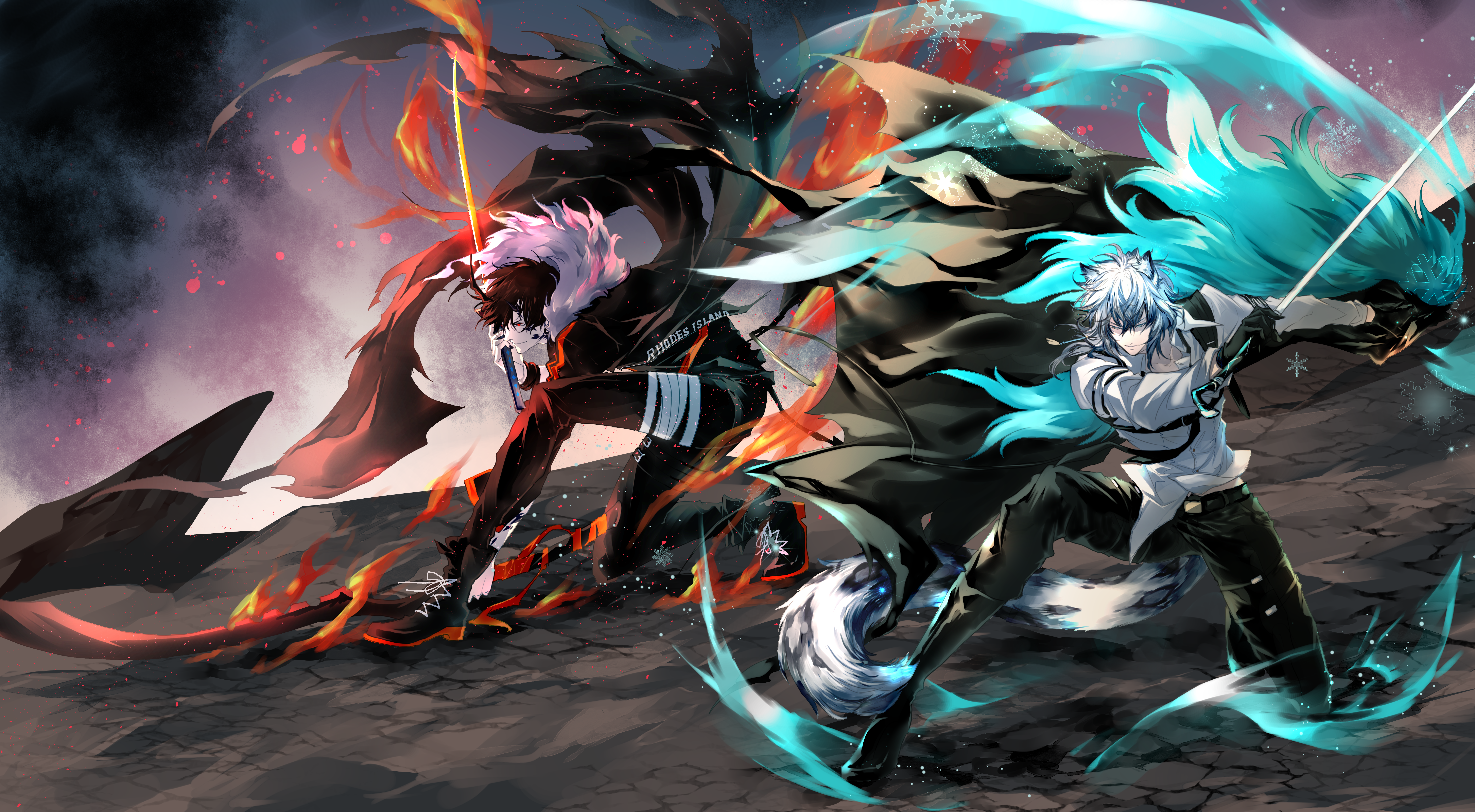 2boys absurdres arknights aura fire flamebringer_(arknights) highres holding holding_sword holding_weapon material_growth merry_(secilhodoshima) multiple_boys oripathy_lesion_(arknights) shirt silverash_(arknights) sword weapon white_shirt