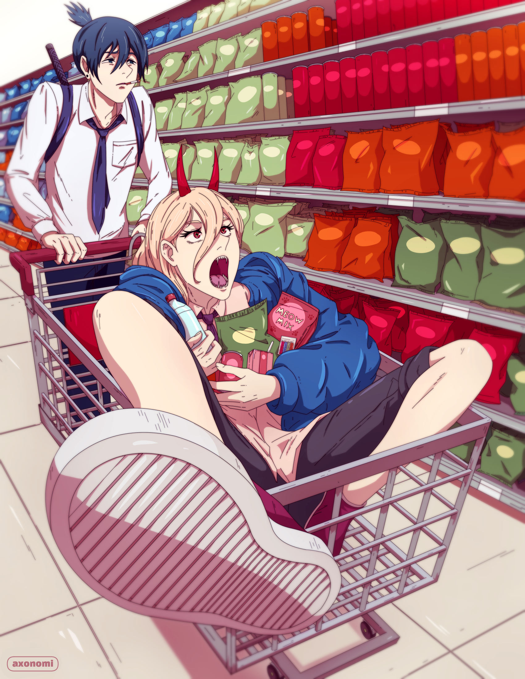 1boy 1girl axonomi black_necktie black_shorts blue_hoodie chainsaw_man cigarette collared_shirt cross-shaped_pupils demon_girl demon_horns earrings footwear_focus hair_between_eyes hair_bun hayakawa_aki highres hood hoodie horns in_shopping_cart jewelry necktie open_mouth perspective pixiv_username power_(chainsaw_man) red_horns sharp_teeth shirt shop shopping_cart shorts stud_earrings symbol-shaped_pupils teeth topknot