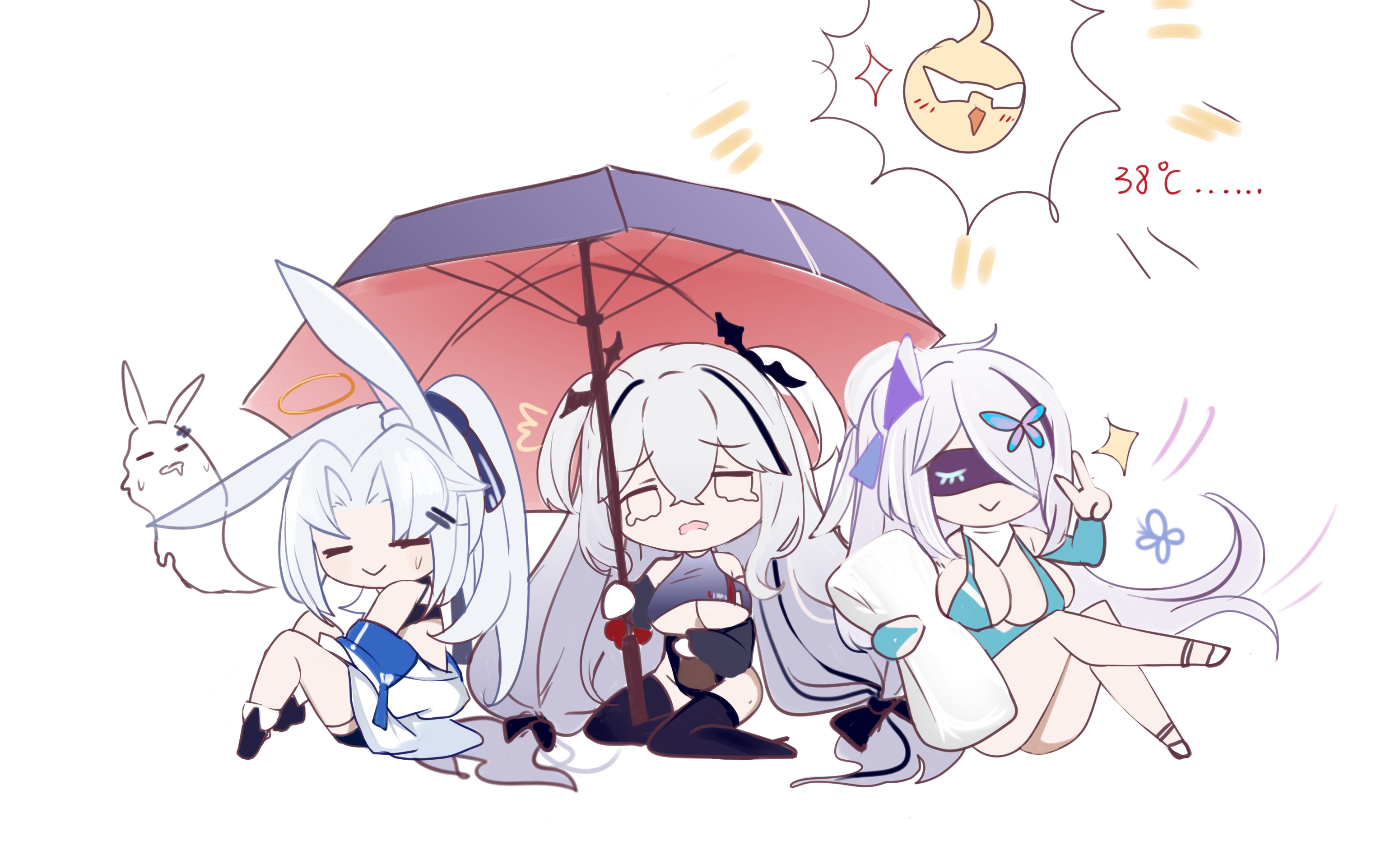 3girls alternate_costume animal_ears azur_lane banchiyuebai black_bow black_footwear boots bow chibi elbing_(azur_lane) high_ponytail highres hiryuu_(azur_lane) holding holding_umbrella long_hair manjuu_(azur_lane) multicolored_hair multiple_girls parasol parted_bangs ponytail purple_hair rabbit_ears rabbit_girl race_queen simple_background sparkle streaked_hair sweatdrop thigh_boots two_side_up umbrella unzen_(azur_lane) very_long_hair white_background white_hair