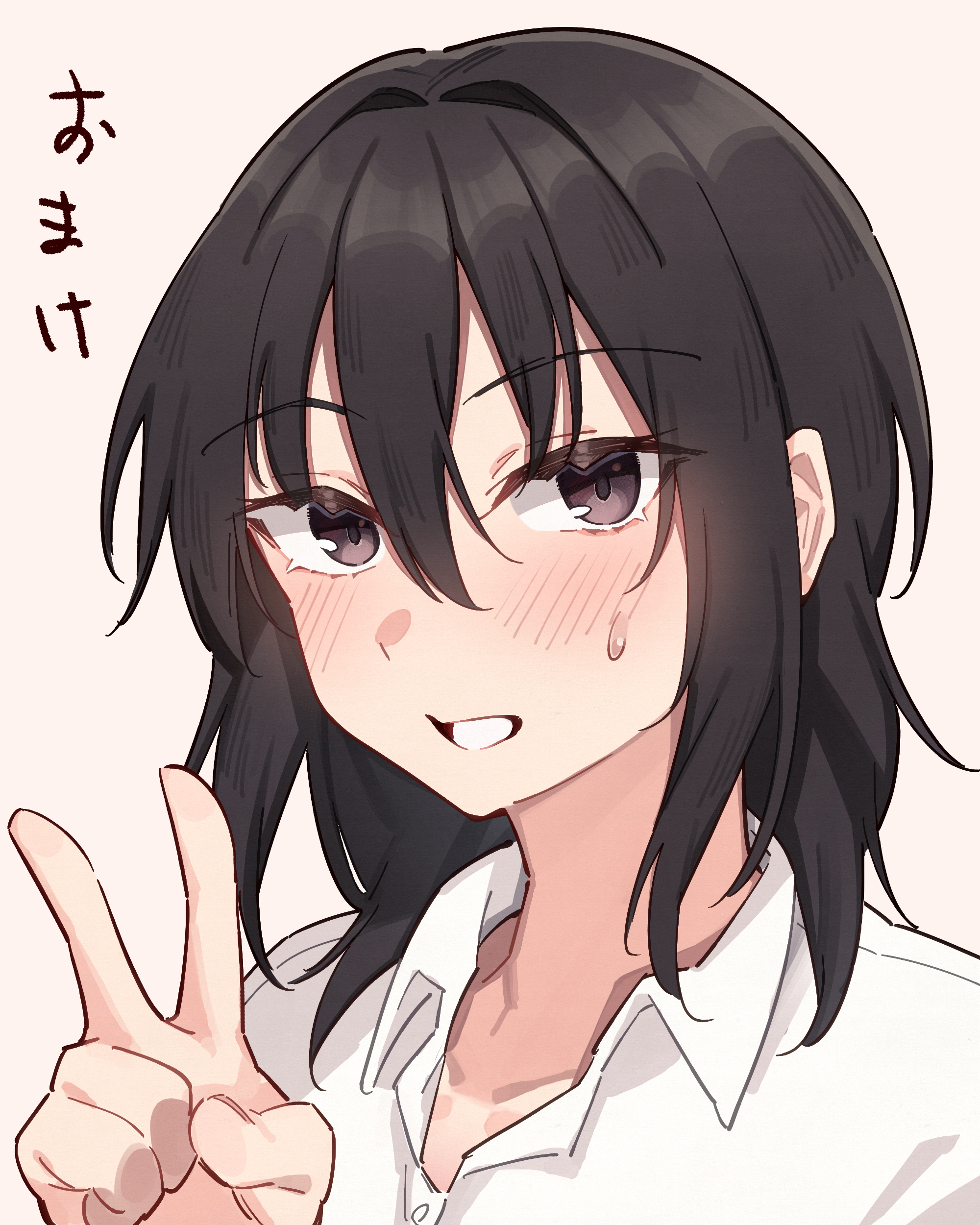 1girl absurdres batatata77 black_hair brown_hair collared_shirt cropped_arm cropped_torso highres medium_hair original shirt sidelocks sweatdrop v white_background white_shirt