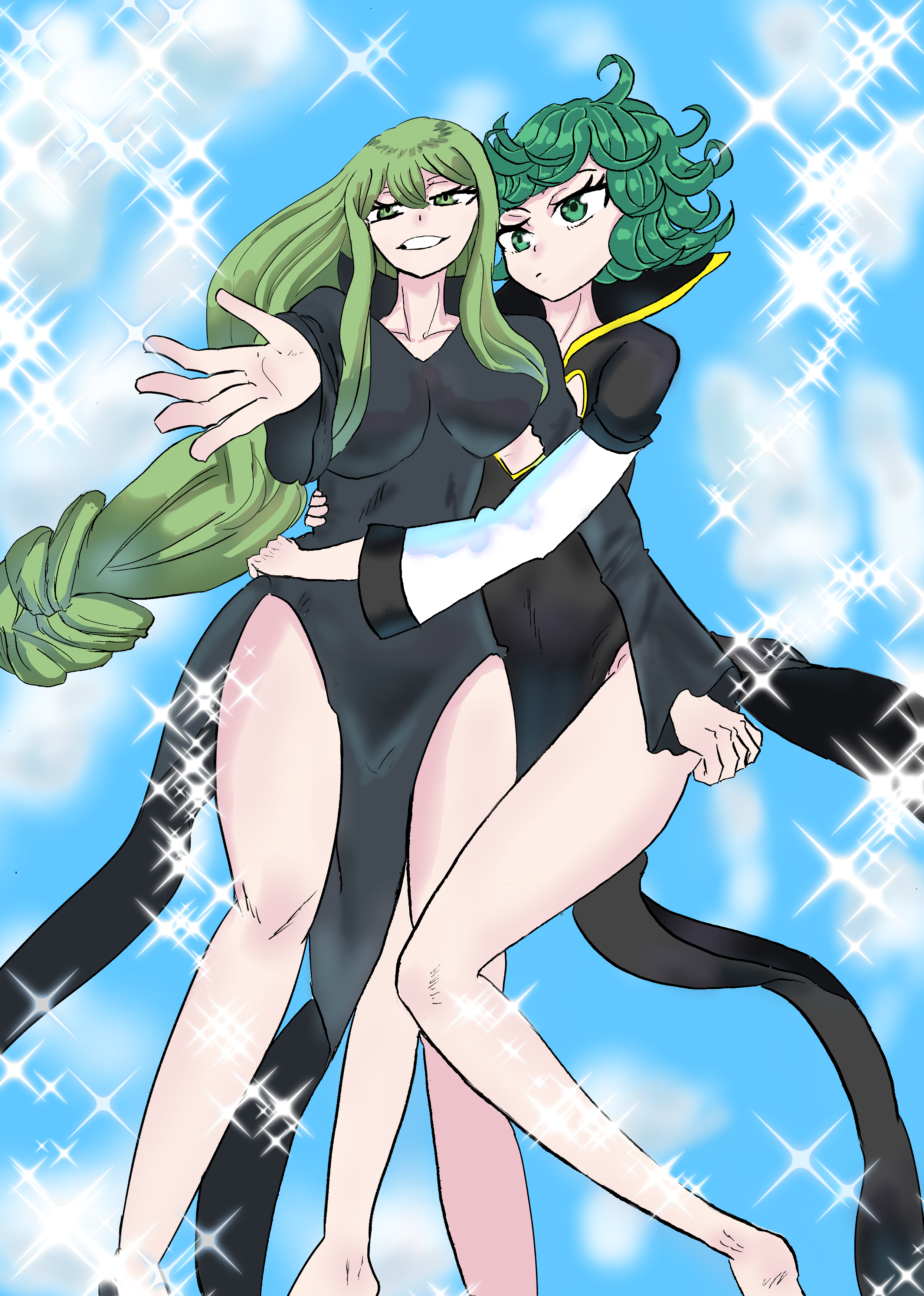 2girls absurdres black_dress breasts crossover curly_hair dress eden's_zero green_eyes green_hair highres large_breasts long_hair long_sleeves multiple_girls no_panties one-punch_man quad_braids revealing_clothes short_hair sideboob sky smile sorambk striped_clothes striped_dress tatsumaki thighs tight_clothes witch_regret