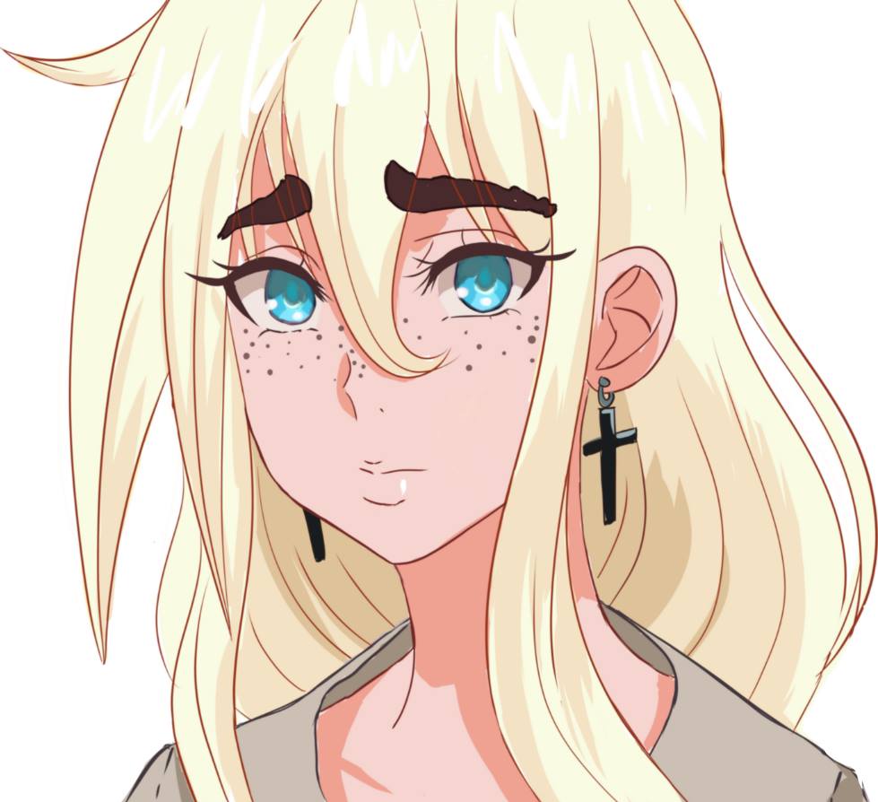 1girl blonde_hair blue_eyes close-up cross cross_earrings earrings freckles jewelry lummypixith original simple_background solo white_background