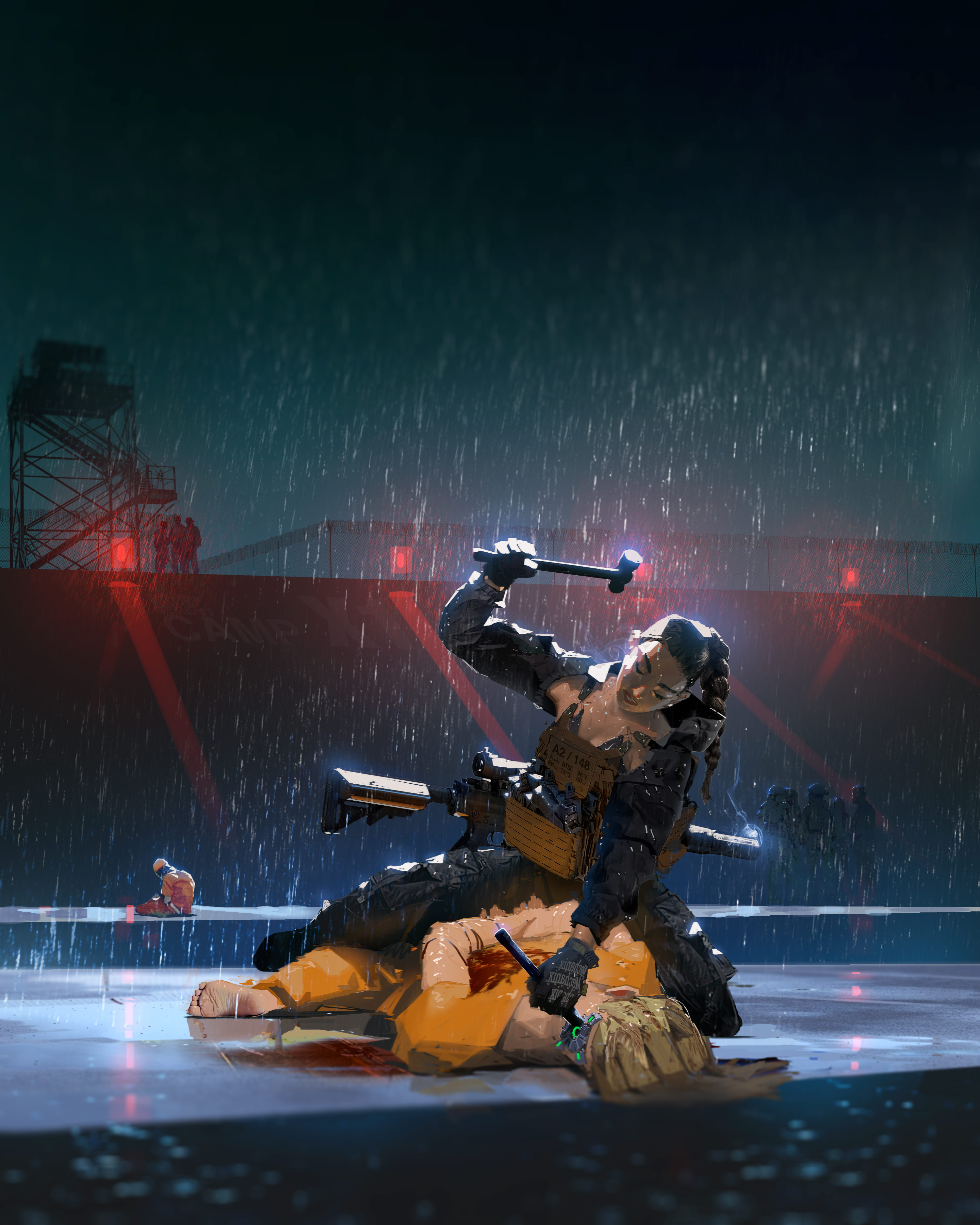 absurdres assault_rifle blood blood_on_clothes braid braided_ponytail bulletproof_vest chisel cyberpunk gun hammer highres holding holding_chisel holding_hammer imminent_death mechanix_wear night ponytail prison prison_clothes prisoner rain restrained rifle scope suppressor weapon wronci