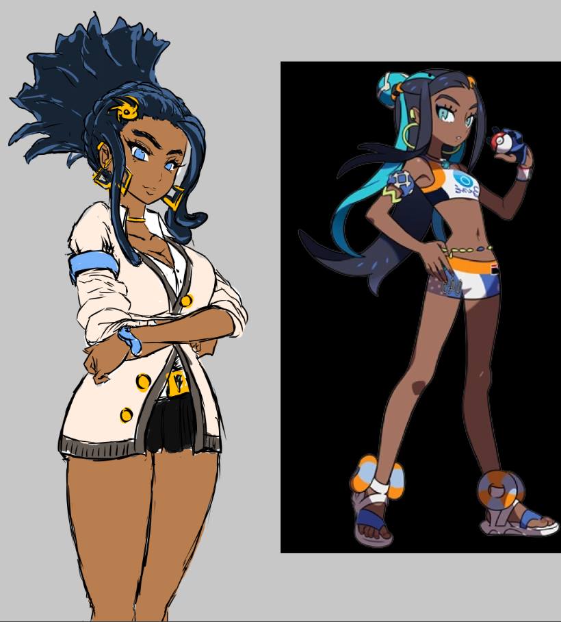 1girl blue_eyes dark-skinned_female dark_skin female_focus lummypixith nessa_(pokemon) nintendo pokemon pokemon_sword_and_shield reference_photo sketch skirt sleeves_rolled_up