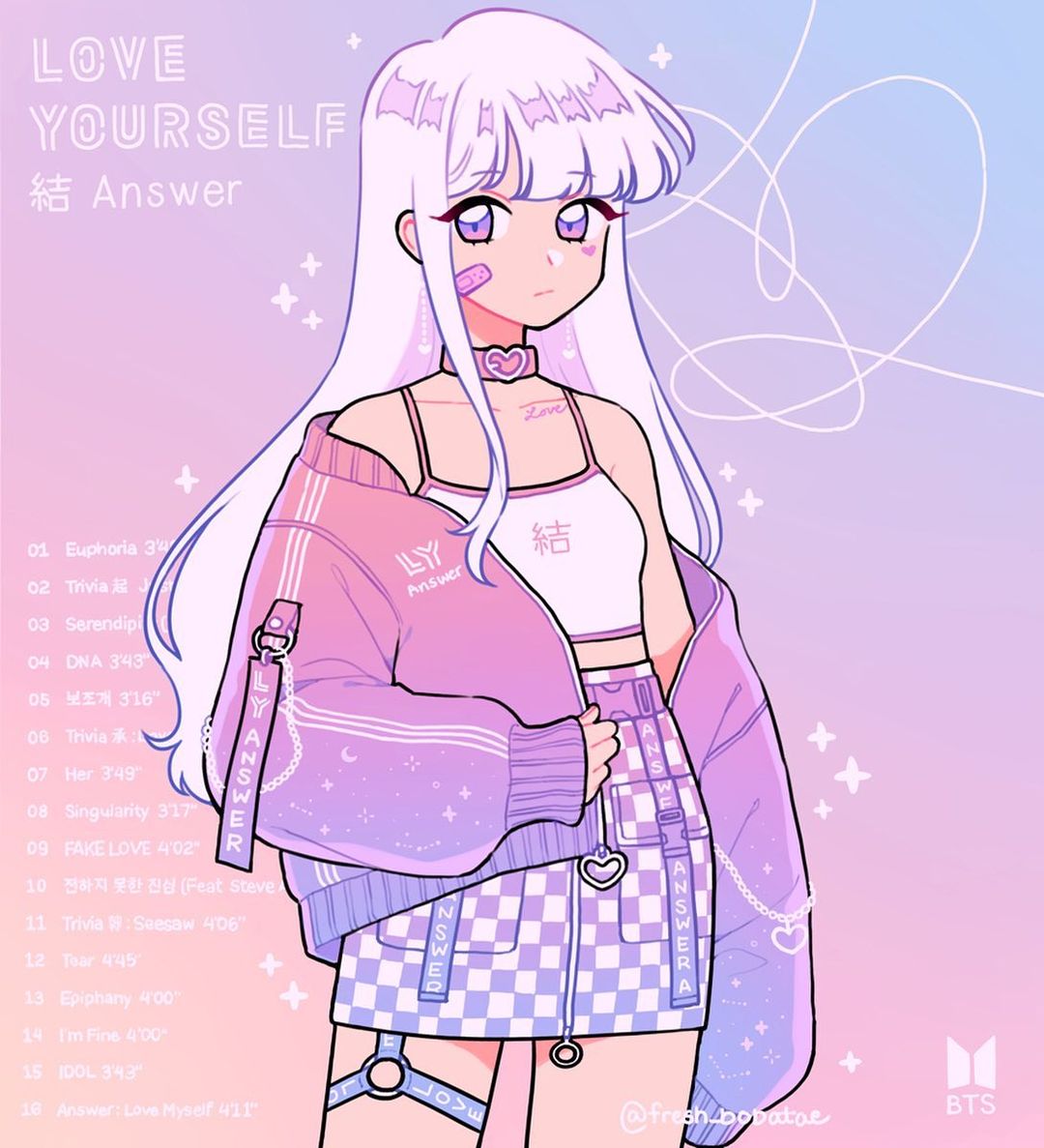 1girl backstreet_boys bandaid bandaid_on_cheek bandaid_on_face bare_shoulders belt belt_buckle belt_collar blue_background body_writing buckle checkered_clothes checkered_skirt closed_mouth clothes_writing collar copyright_name cowboy_shot denim denim_skirt emily_kim fingernails gradient_background gradient_clothes gradient_jacket heart heart-shaped_buckle heart_of_string heart_on_cheek instagram_username jacket light_frown long_hair long_sleeves marking_on_cheek midriff multicolored_background o-ring open_clothes open_jacket original pink_background pink_belt pink_jacket pocket puffy_long_sleeves puffy_sleeves purple_background purple_belt purple_eyes purple_jacket purple_skirt skirt sleeves_past_wrists solo sparkle tank_top thigh_strap two-tone_skirt very_long_hair white_hair white_skirt white_tank_top zipper zipper_pull_tab