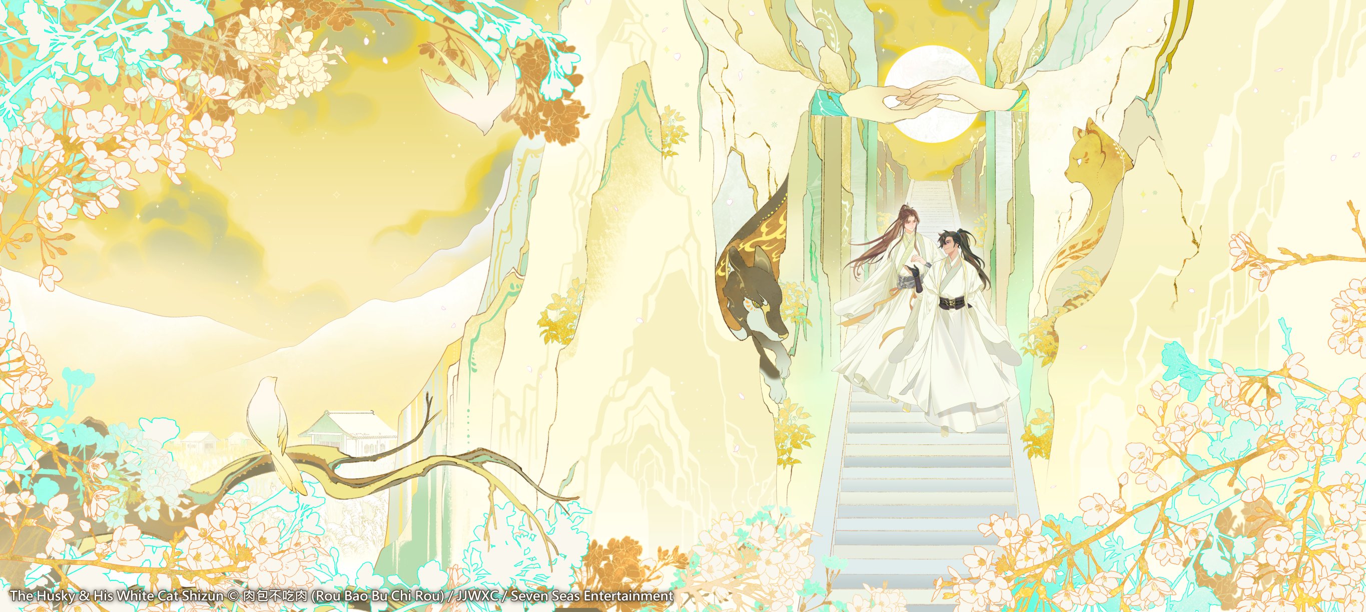 2boys architecture bird black_gloves black_hair branch brown_hair cat chinese_clothes chinese_hairpin chu_wanning commentary copyright_name dog east_asian_architecture english_commentary erha_he_ta_de_bai_mao_shizun flower full_body gloves hanfu high_ponytail highres holding_hands long_hair long_sleeves looking_at_another mo_ran mountain multiple_boys official_art partially_fingerless_gloves ponytail purple_eyes ribbon stairs stone_stairs suto_(sakumaaritsu) tree walking white_hanfu wide_sleeves xiao_guan_(headdress) yellow_eyes yellow_ribbon