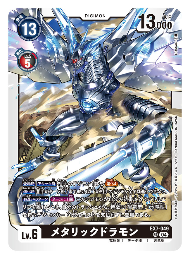 armor artist_name card_(medium) character_name commentary_request copyright_name digimon digimon_(creature) digimon_card_game dragon dust gossan mechabare mechanical_wings metallicdramon non-humanoid_robot official_art red_eyes robot robot_dragon trading_card translation_request white_armor wings