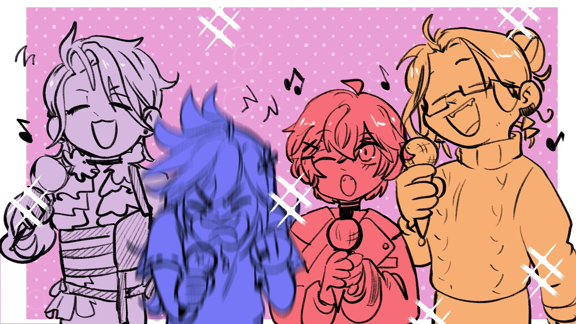 4boys ahoge banzoin_hakka banzoin_hakka_(2nd_costume) black_choker border choker closed_eyes commentary facing_viewer fangs frilled_shirt frills gavis_bettel gavis_bettel_(2nd_costume) grey_hair hair_bun happy highres holding holding_microphone holostars holostars_english inchells josuiji_shinri josuiji_shinri_(2nd_costume) karaoke looking_at_another looking_at_viewer machina_x_flayon machina_x_flayon_(2nd_costume) male_focus medium_hair microphone multiple_boys music musical_note one_eye_closed open_mouth pink_background screaming shirt singing sketch smile sparkle star_(symbol) sweater turtleneck turtleneck_sweater upper_body virtual_youtuber