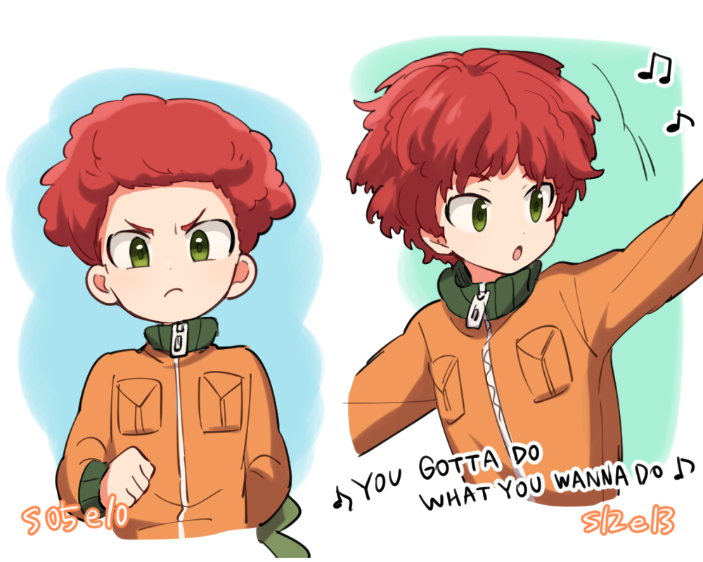 1boy afro english_text episode_number frown green_eyes haizai high_collar jacket kyle_broflovski male_focus messy_hair multiple_views musical_note open_mouth outstretched_arms red_hair south_park v-shaped_eyebrows zipper