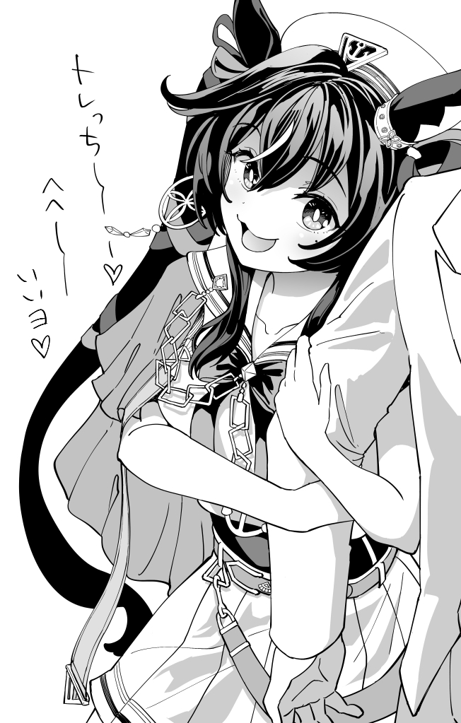 1girl animal_ears arm_hug belt breasts collarbone hair_between_eyes hair_ornament hat horse_ears horse_girl looking_at_viewer medium_breasts mole mole_under_eye monochrome pov shinba_yagi solo_focus translation_request umamusume vivlos_(umamusume) white_background