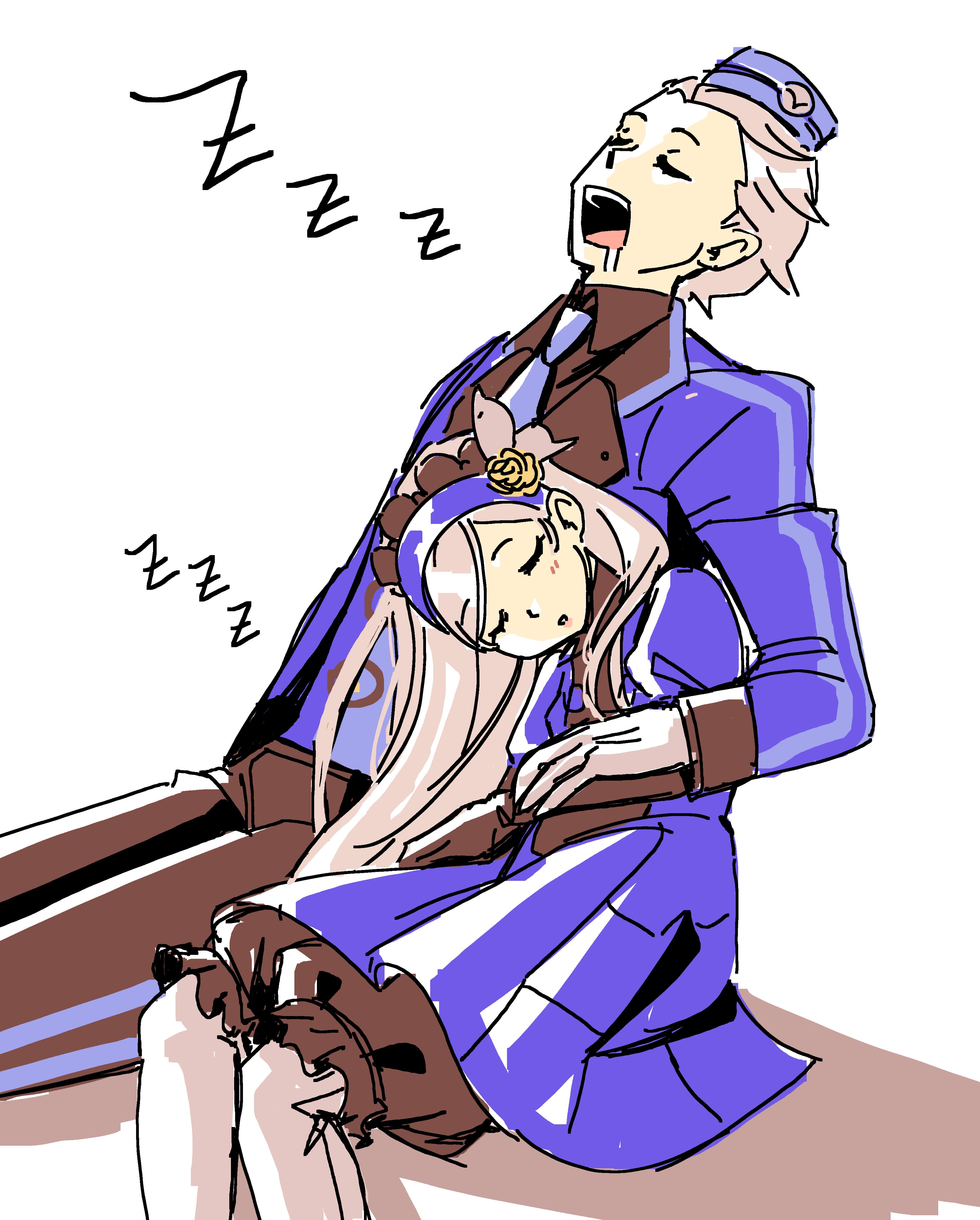 1boy 1girl absurdres arm_around_shoulder black_shirt bloomers blue_dress blue_headband blue_jacket blue_necktie brother_and_sister brown_gloves brown_pants butterfly_hair_ornament closed_eyes collared_shirt dress drooling elbow_gloves hair_flower formal_clothes frilled_headband gimmie20dollas gloves hair_ornament hat headband highres jacket lavenza_(persona_5) leaning_back leaning_on_person long_hair necktie open_mouth pants pantyhose persona persona_5 shirt siblings sitting sleeping sleeping_on_person striped_clothes striped_pants suit theodore_(persona) underwear white_gloves white_hair white_pantyhose zzz